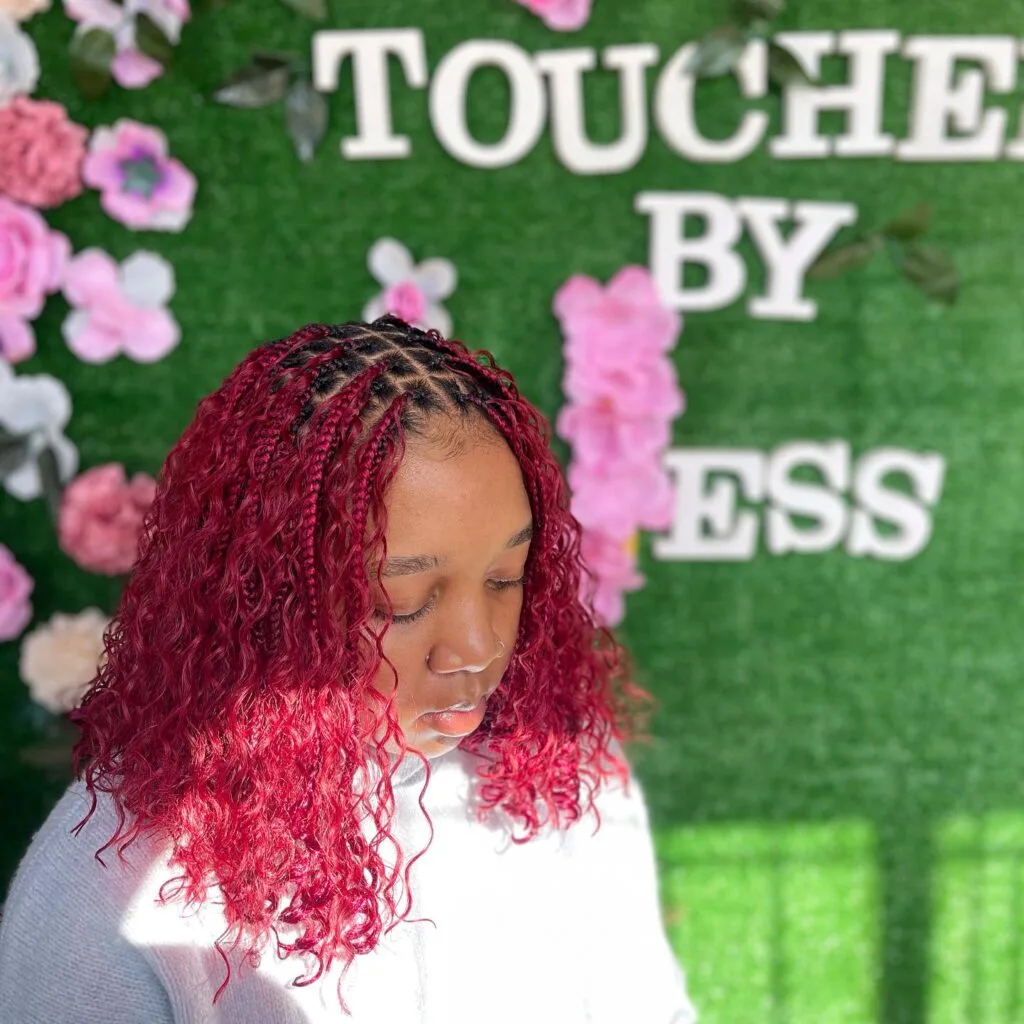 This vibrant boho bob stands out with rich burgundy curls blended beautifully with slim braids for striking contrast.