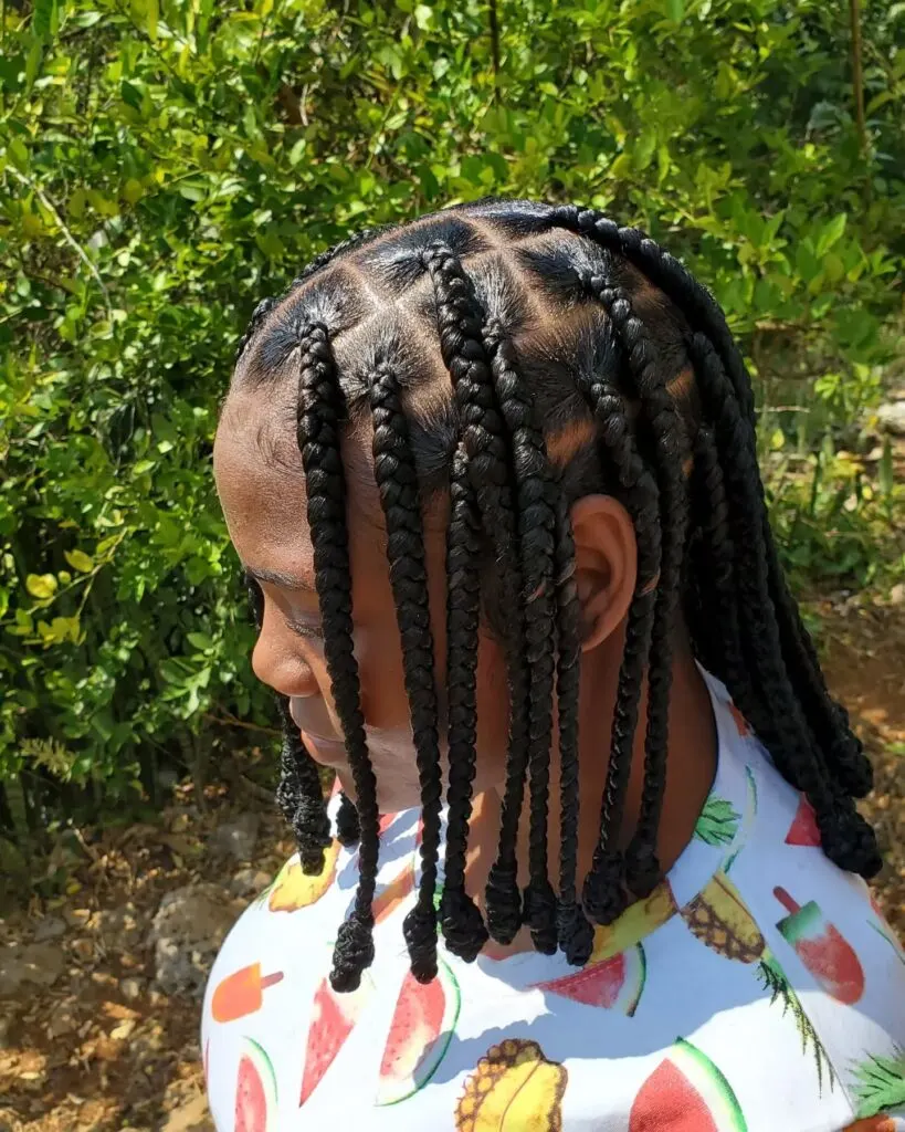 This hairstyle is perfect for those who love a neat, statement-making style that lasts. To keep the scalp healthy and reduce frizz, lightly oil the roots and moisturize the braids. Add hair cuffs or beads to highlight the geometric parts and personalize the overall design.