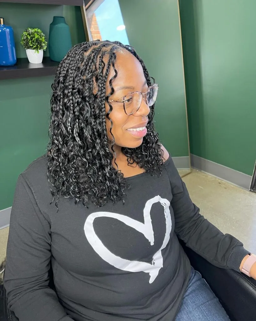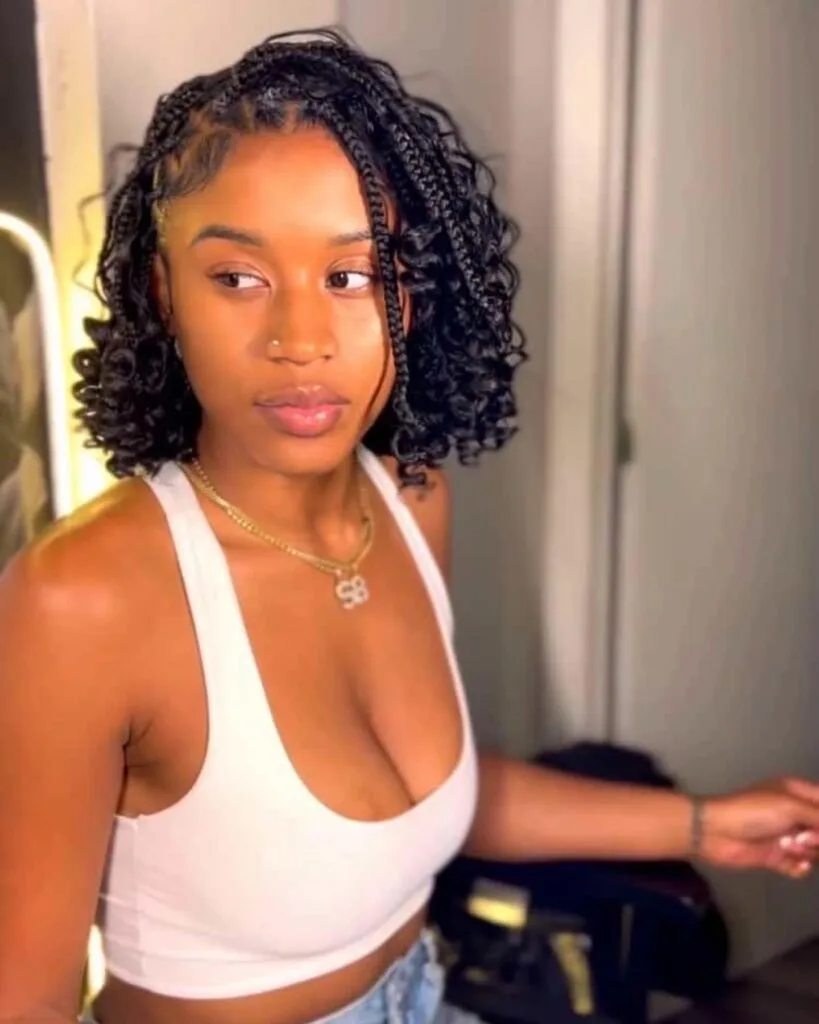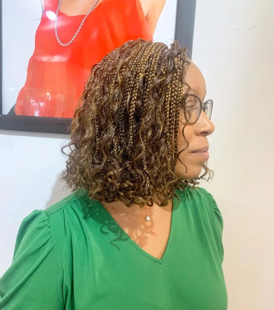 This hairstyle blends slim braids with springy, loose curls, creating a playful and stylish bob silhouette.