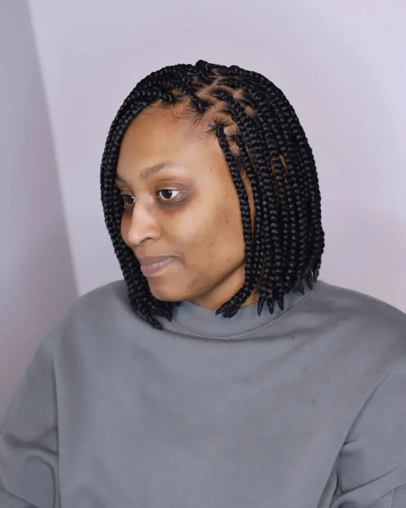 This striking bob showcases thick, sharply parted box braids with geometric precision for a bold, contemporary look.