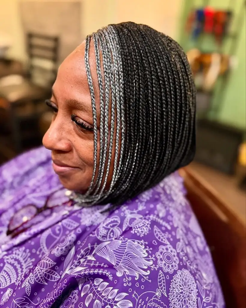 This elegant micro bob blends sleek black braids with striking silver highlights for a sophisticated, modern contrast.