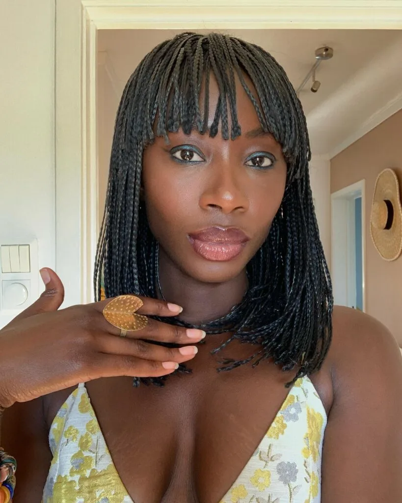 This sleek bob features fine, uniform braids styled with a full fringe that frames the face beautifully. The neatly done micro braids create a smooth, straight silhouette ending right at the collarbone.