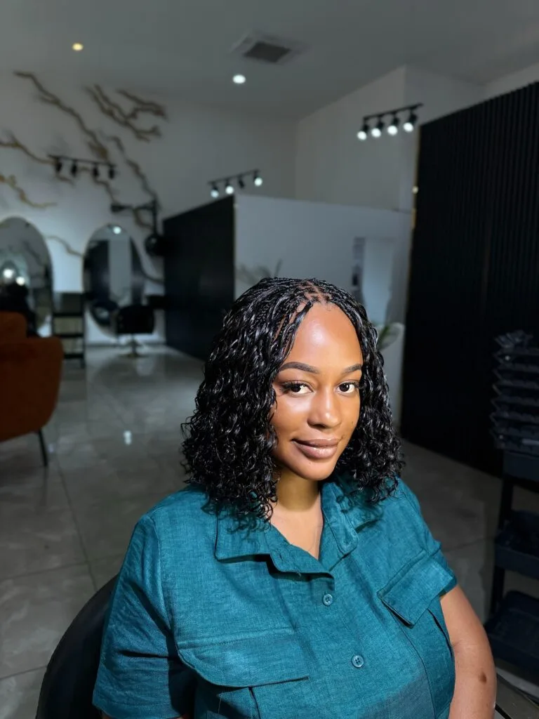 This stunning bob merges neat braids with glossy, water-wave curls for a soft and flowing finish. The braids start precisely at the scalp, then blend into bouncy, defined curls that frame the face beautifully.