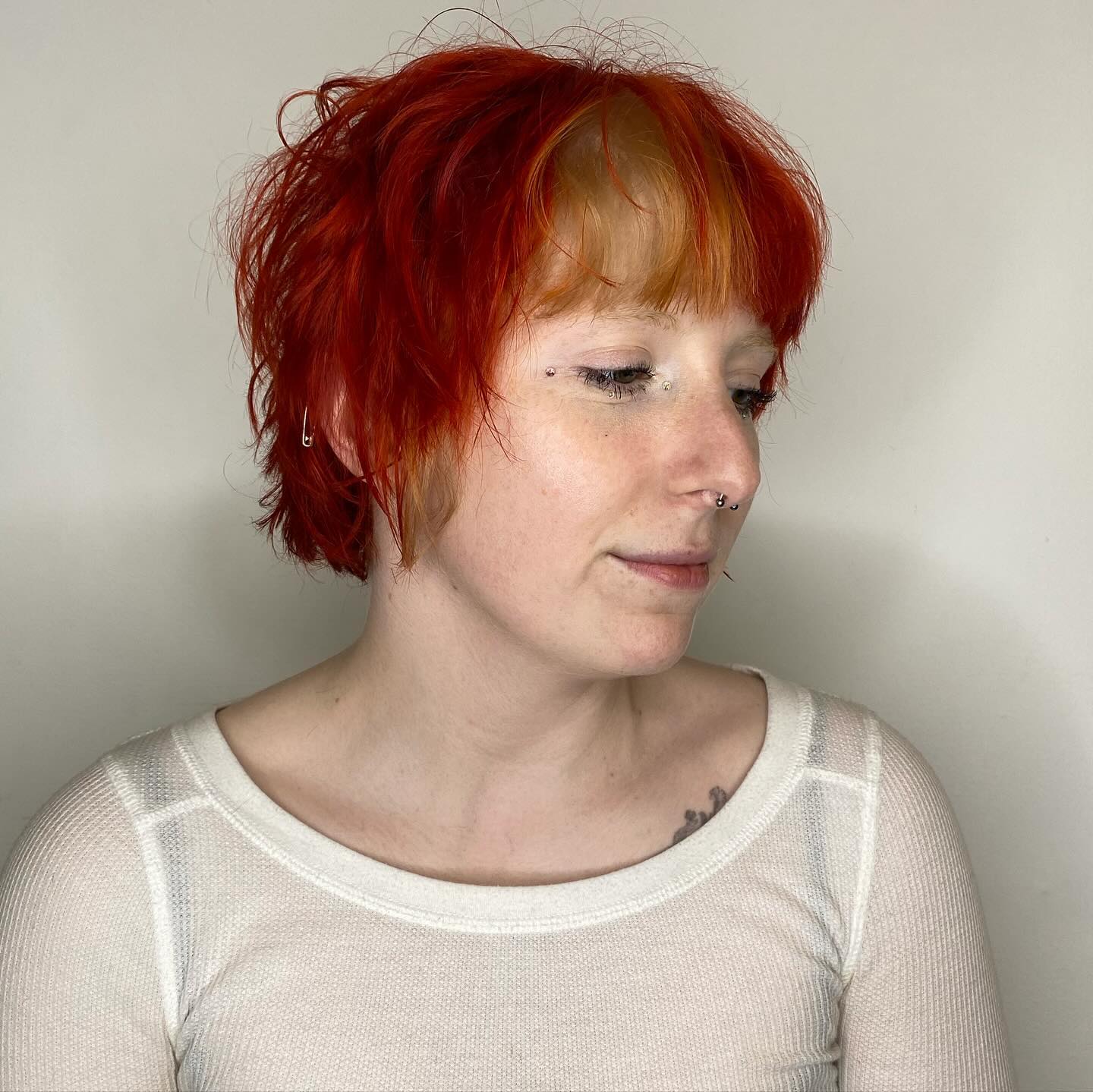 The bright orange hue takes center stage, and the lighter blonde fringe softens the look around the face.