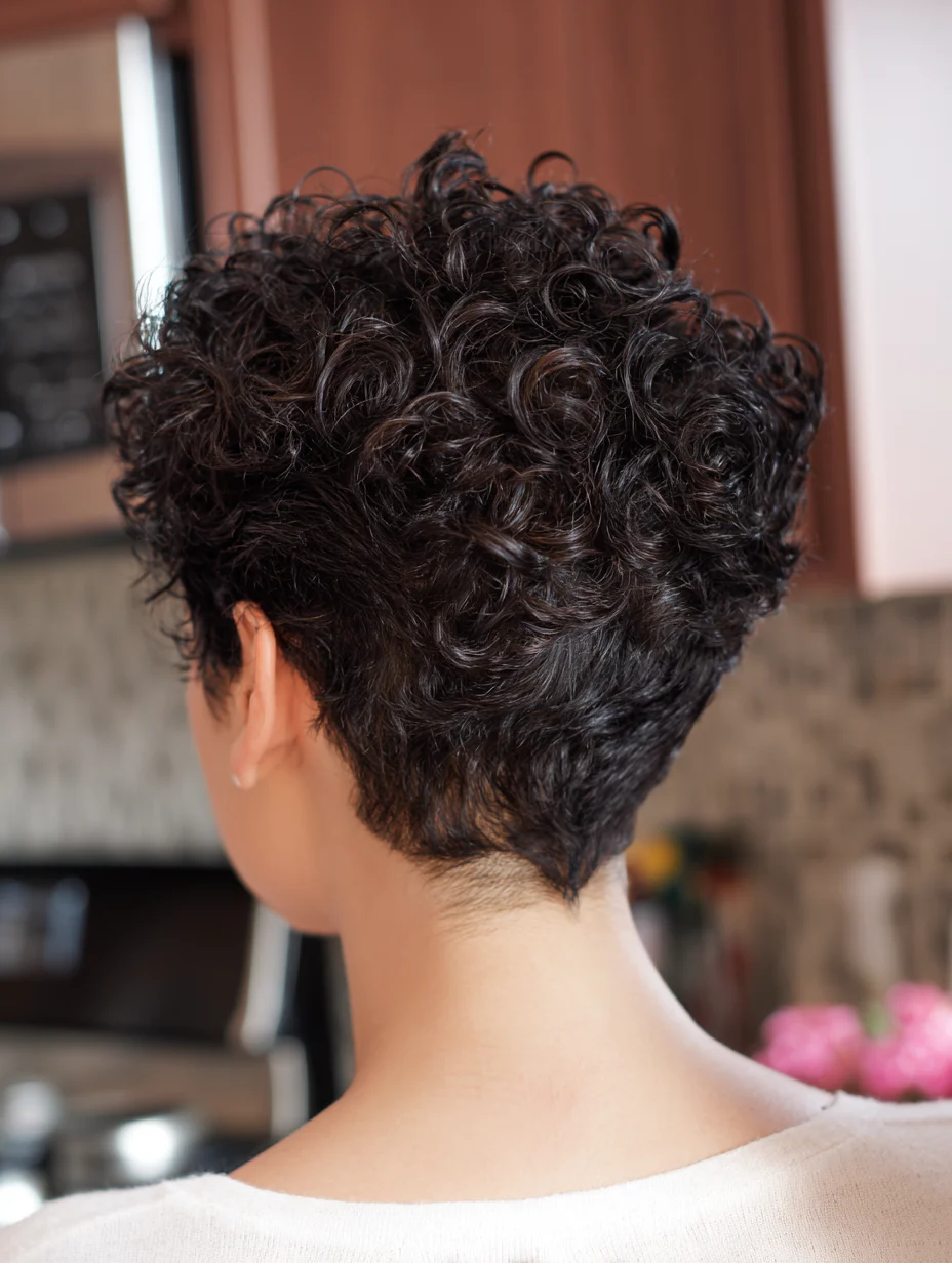 A curly pixie works well for thin fine hair because it highlights natural curl texture instantly. The short length removes weight, letting the curls spring up without effort.