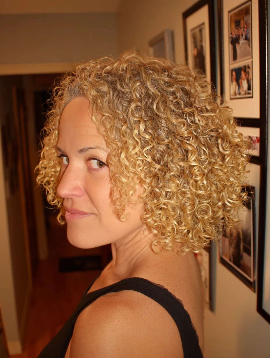 A short curly bob with a side part gives instant height to thin fine hair. The side part pushes curls upward on one side, which creates natural lift.