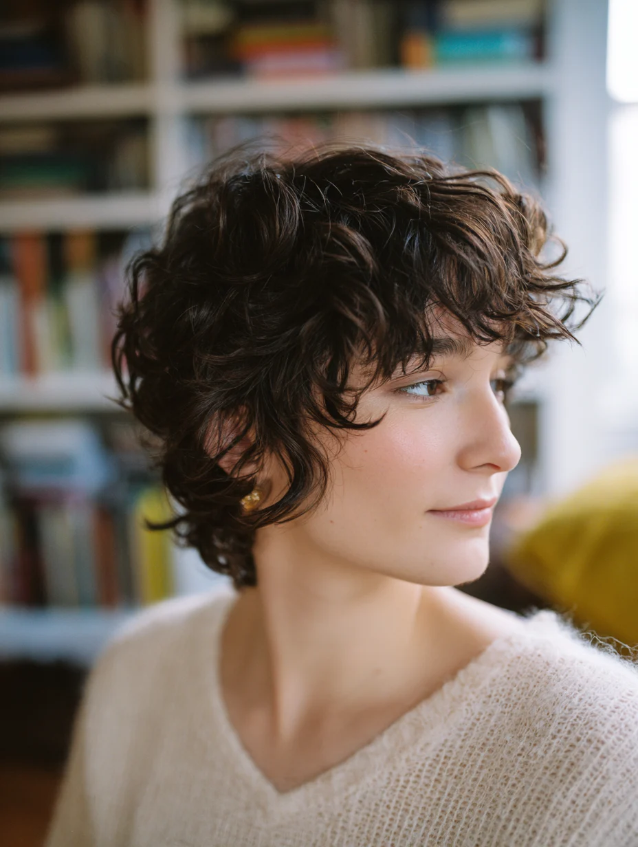 A short curly shag adds movement without overwhelming thin strands. The soft, piecey layers encourage natural separation, which helps the curls look fuller.