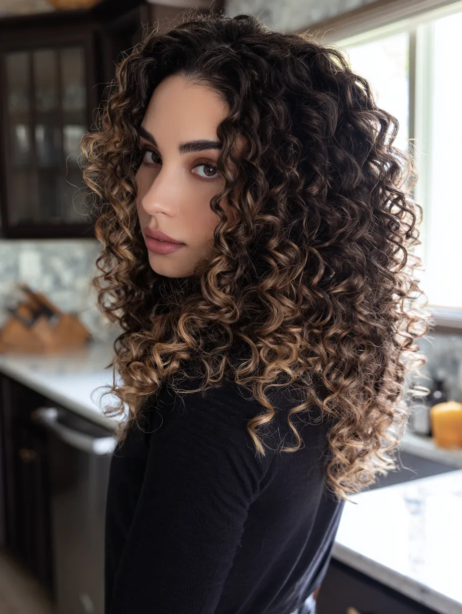 Keep the layers light so the curls maintain their natural pattern. Use a foam or curl cream to control frizz and enhance texture. This style works well when you want a soft, blended look that still feels lively.