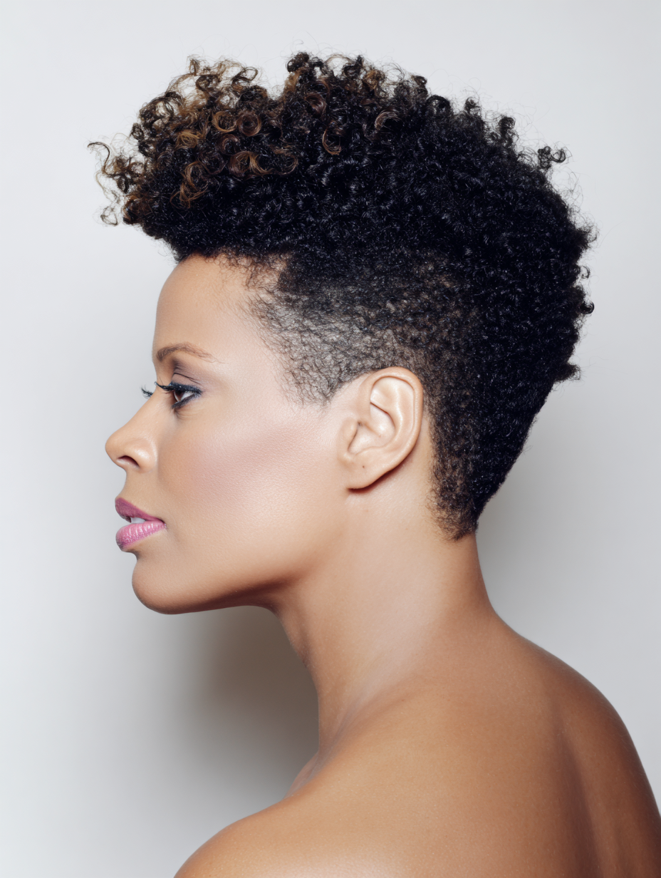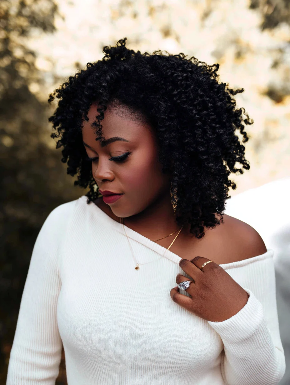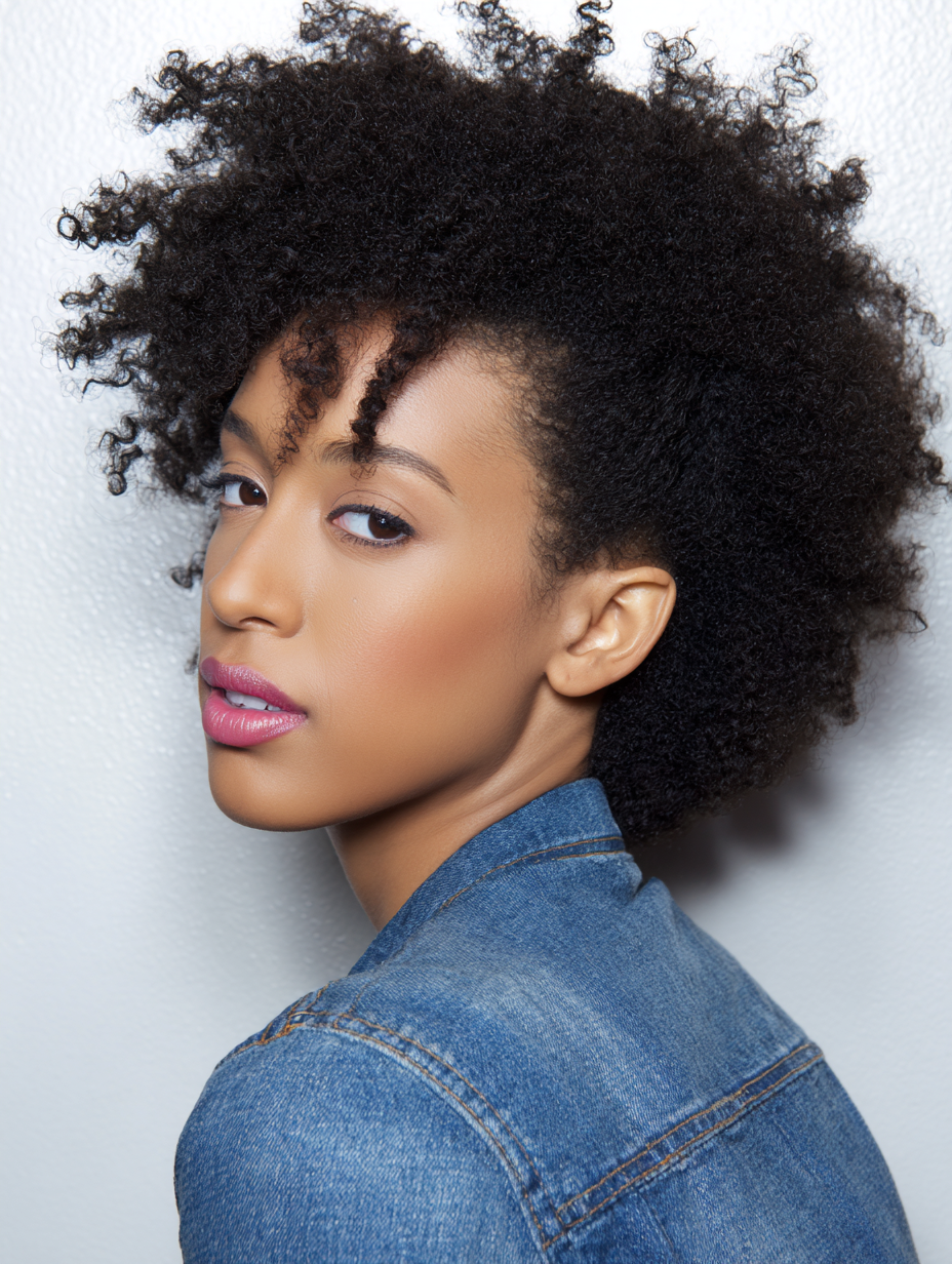 This look celebrates natural texture boldly and makes every curl stand out. It complements glasses, statement earrings, and bright lipstick.