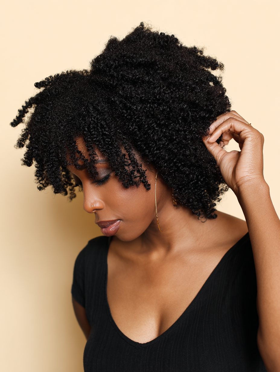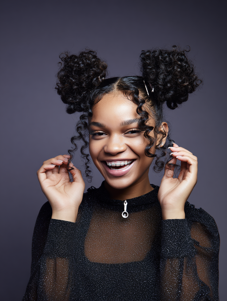 A curl-defining cream keeps coils shiny and soft. The overall look feels youthful, expressive, and perfect for everyday wear or special moments.