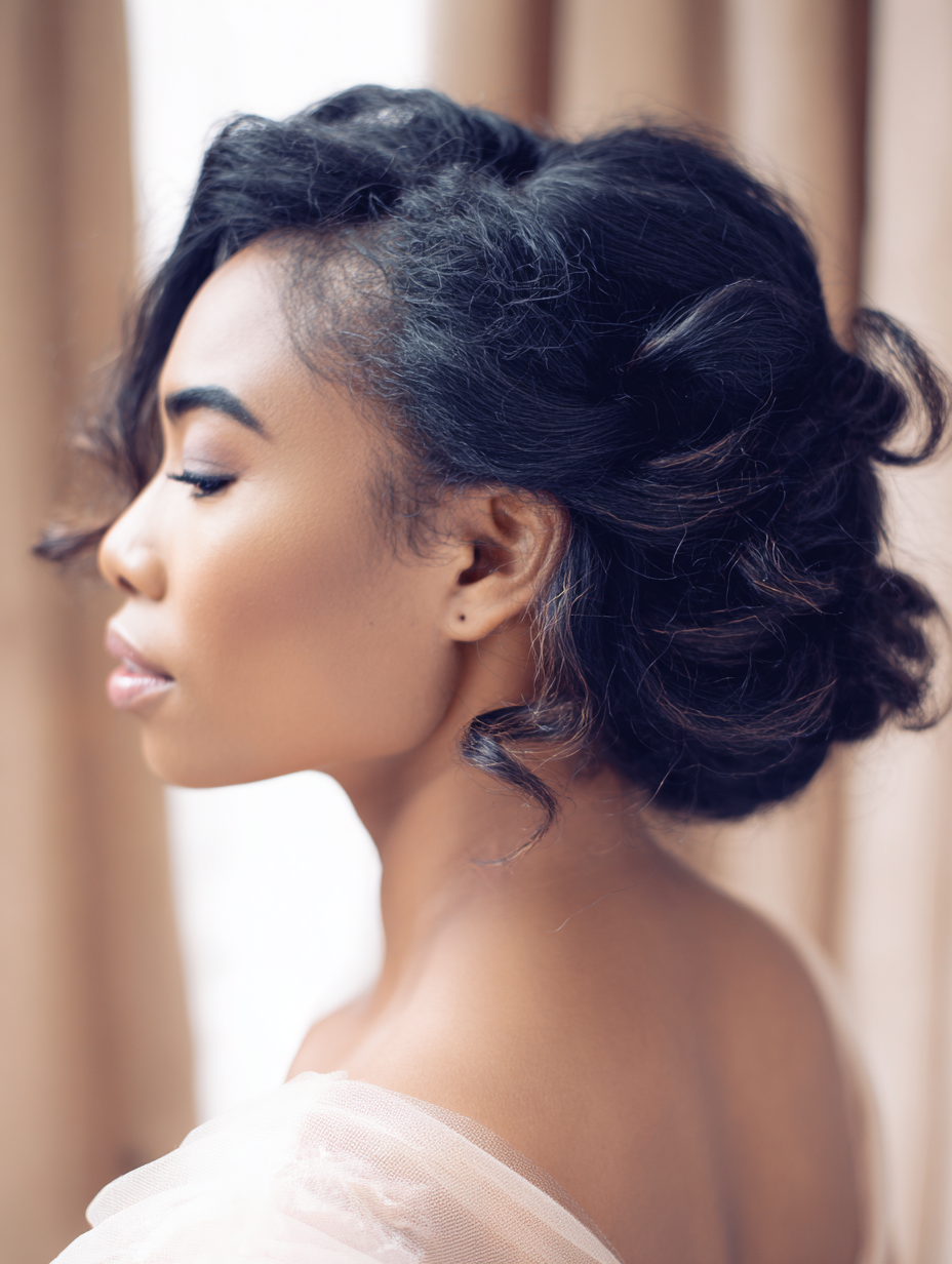 The gathered curls sit neatly at the nape, offering elegance without looking too formal. This style works well for both relaxed and professional environments.