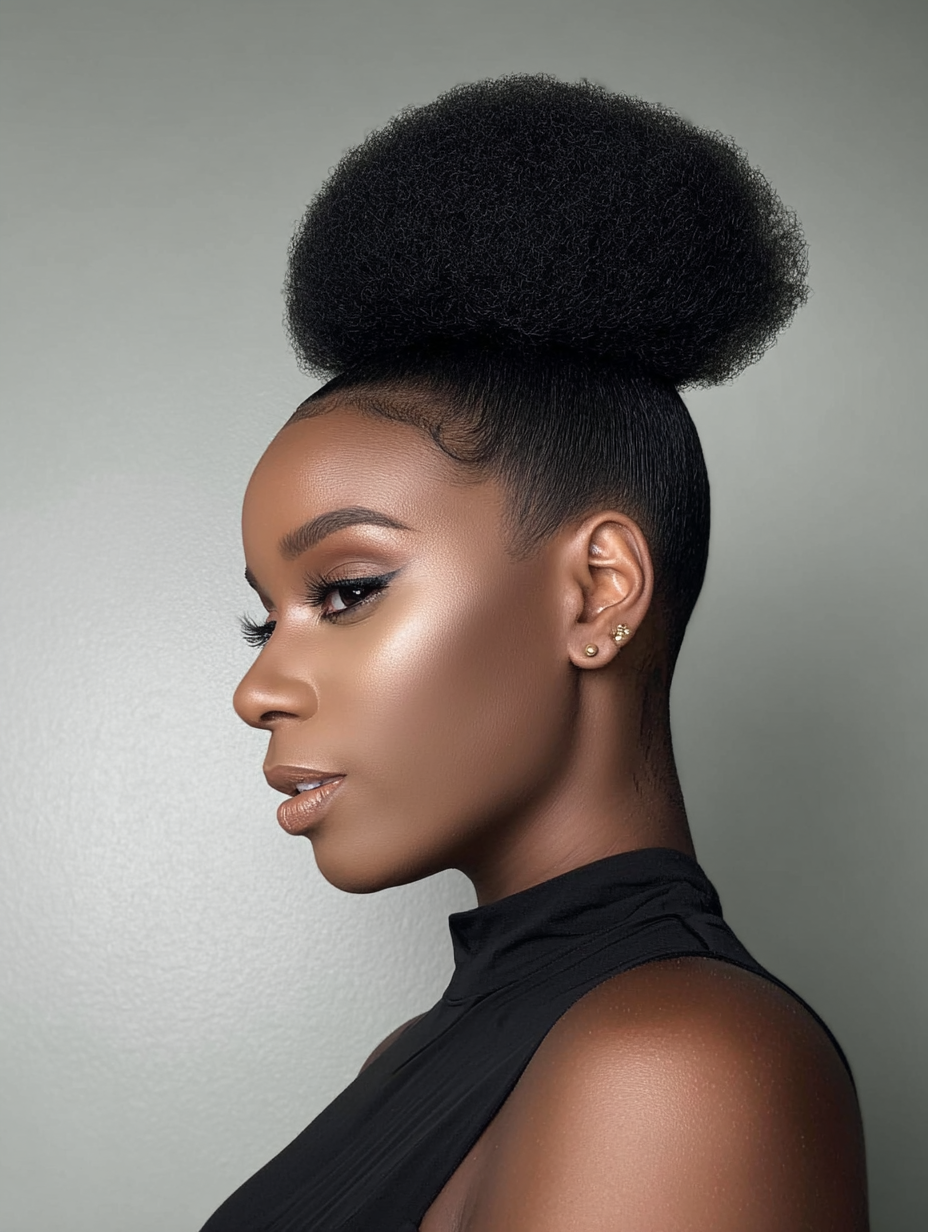 It highlights cheekbones while giving natural curls space to shine freely. Brushed sides create a clean finish that contrasts beautifully with the textured puff.