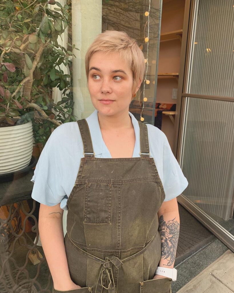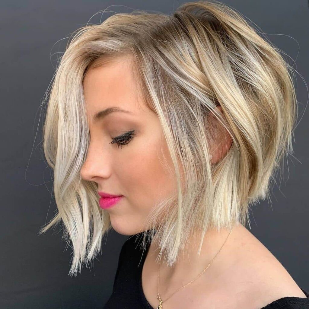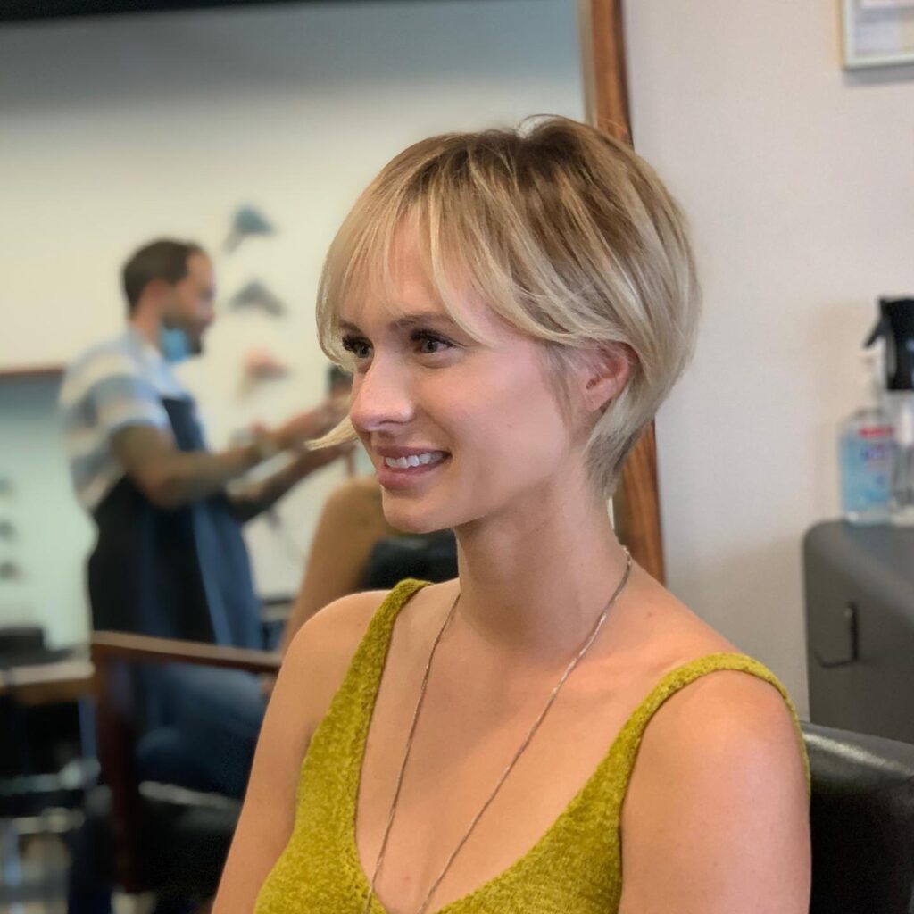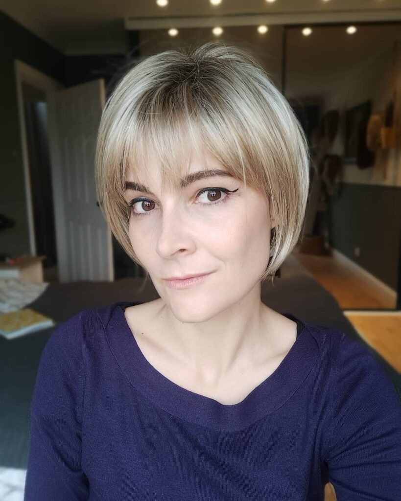 A wispy fringe softens the overall look and enhances the eyes. The light blonde tones and darker roots give the cut natural depth and movement. It’s a neat, polished, and easy-to-style choice that brings softness and structure to short hair without requiring much daily upkeep.