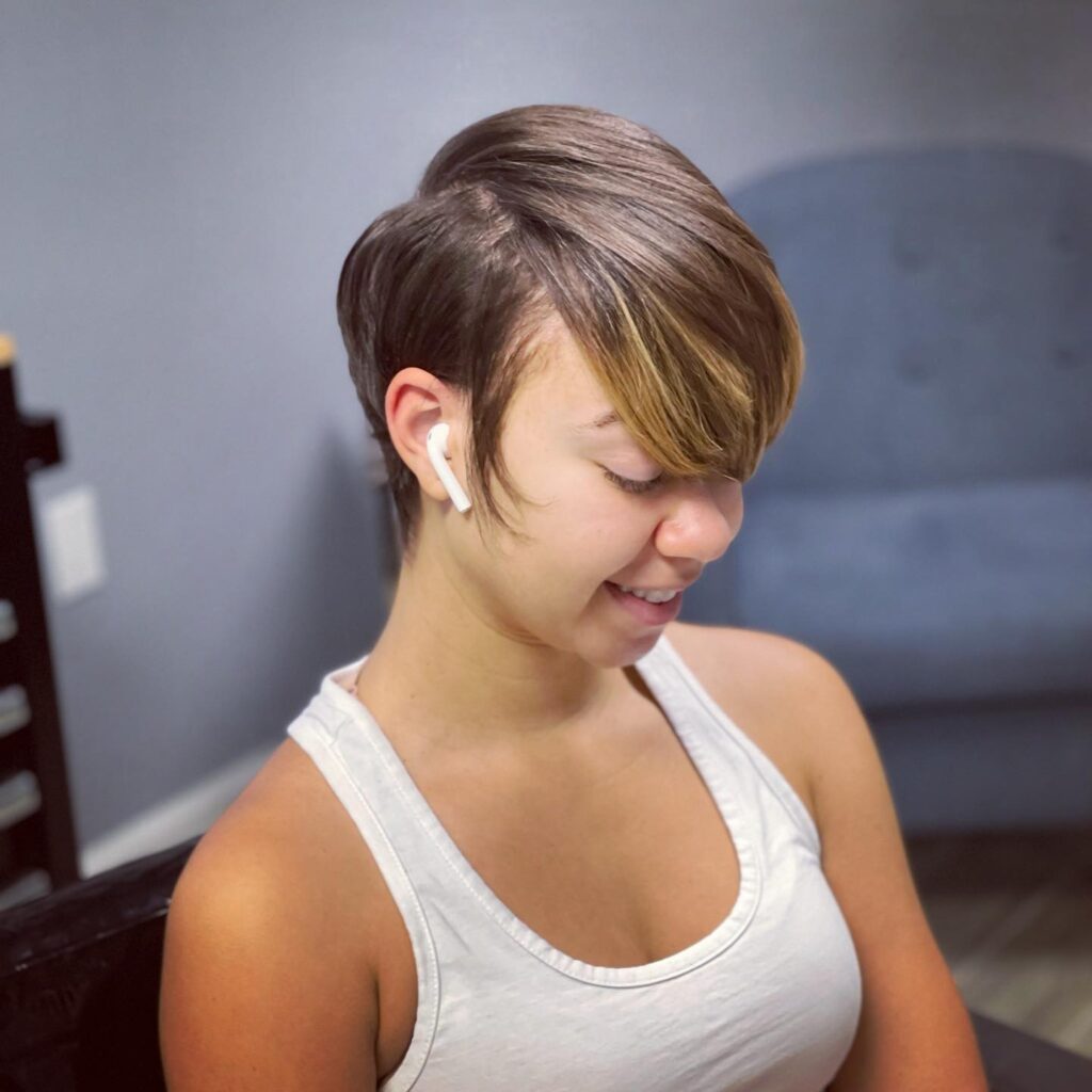Blonde highlights throughout the hair create depth and brightness, enhancing the haircut’s dimension. It’s a perfect choice for anyone looking for a bold yet manageable style. With minimal styling needed to keep its shape, this cute short hairstyle makes a confident statement without sacrificing ease.
