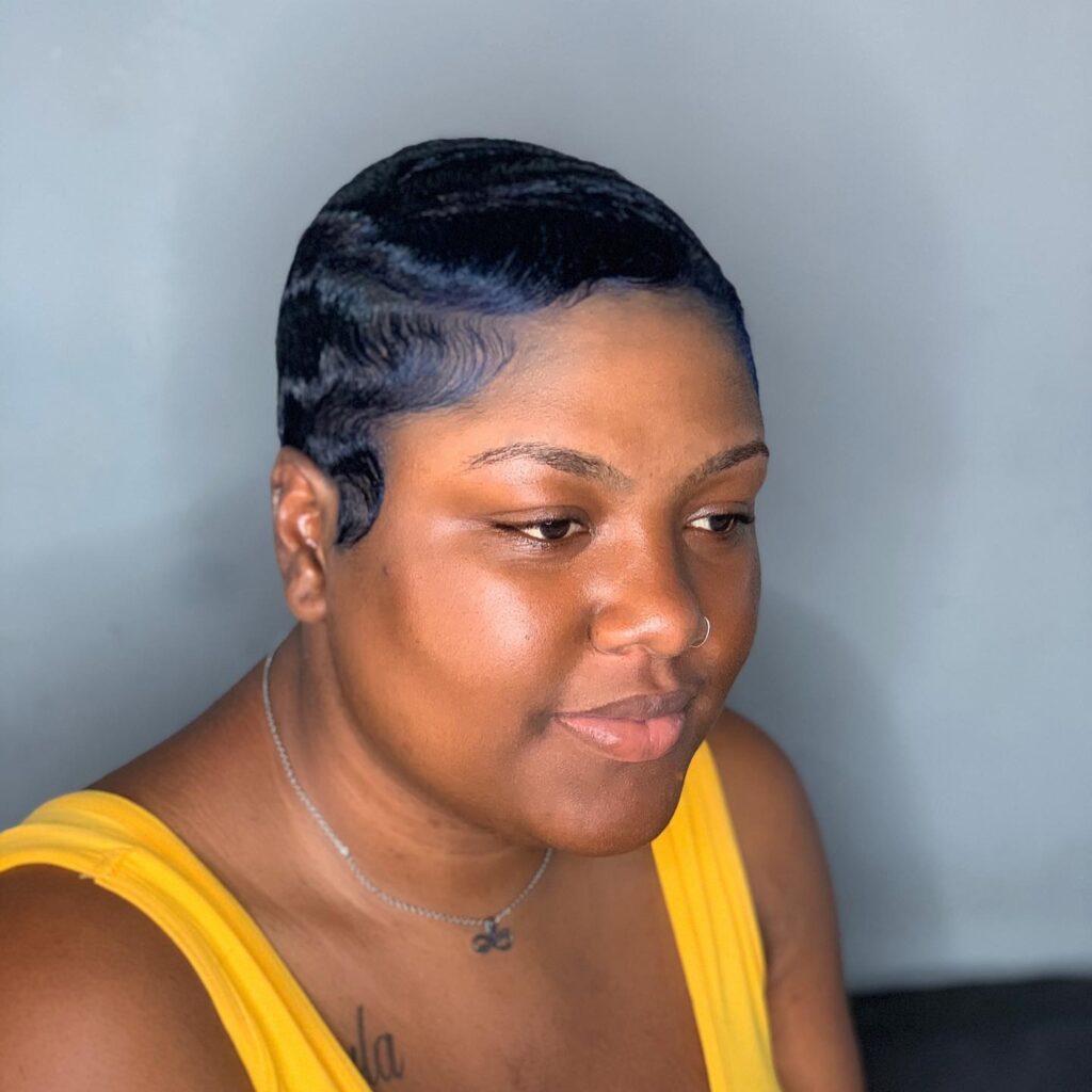 The precision in the waves gives the style a polished, sleek appearance without requiring daily upkeep. It’s perfect for those who want a bold, low-maintenance haircut that still looks intentional and chic. This short hairstyle balances sophistication and ease effortlessly.