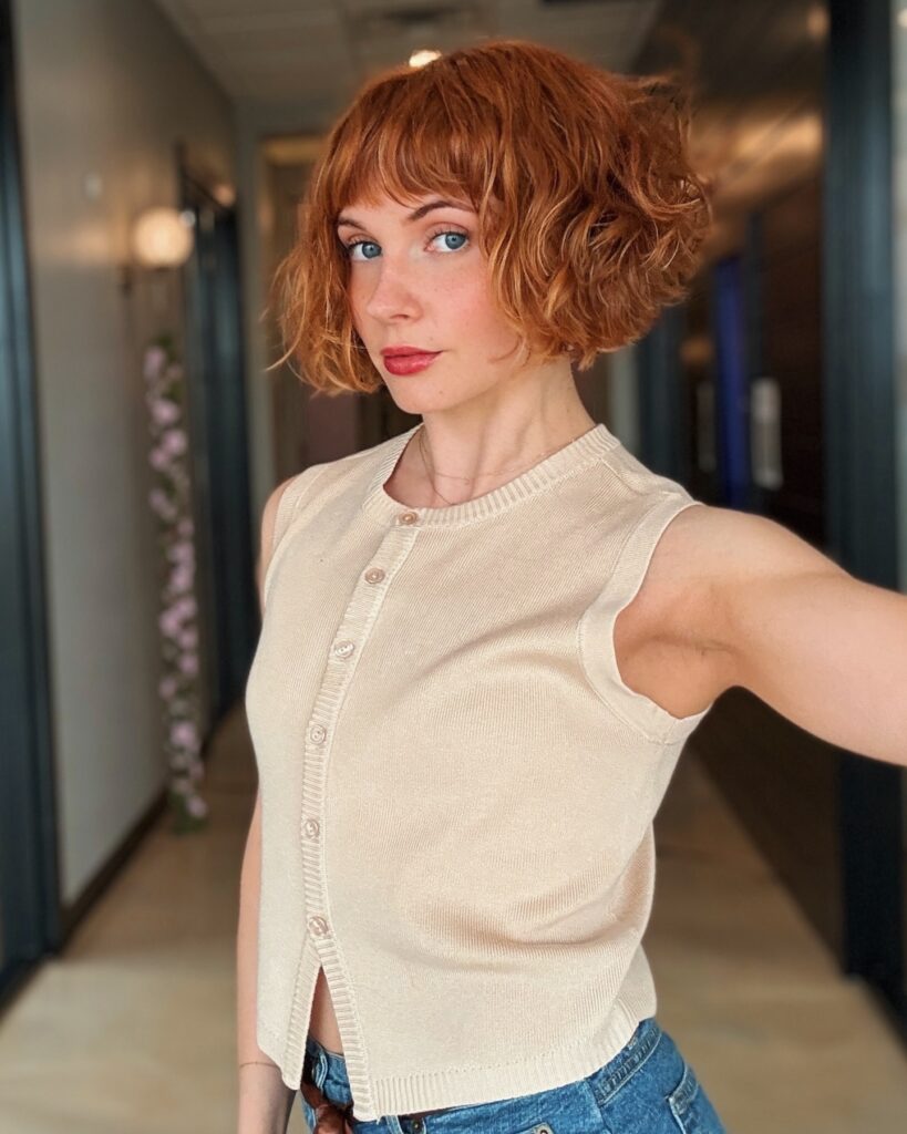 The warm copper tone enhances its charm, adding vibrancy and warmth to the overall look. It’s easy to maintain and doesn’t require perfect styling to look good. This hairstyle is a fun and cute option for anyone who loves effortless texture with a little retro flair.