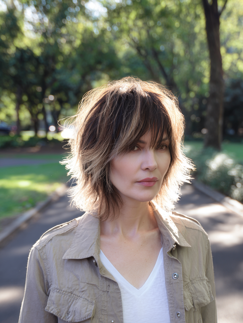 A short wolf cut adds texture on top and lighter layers near the ends. The shape feels fun while still staying easy to manage.