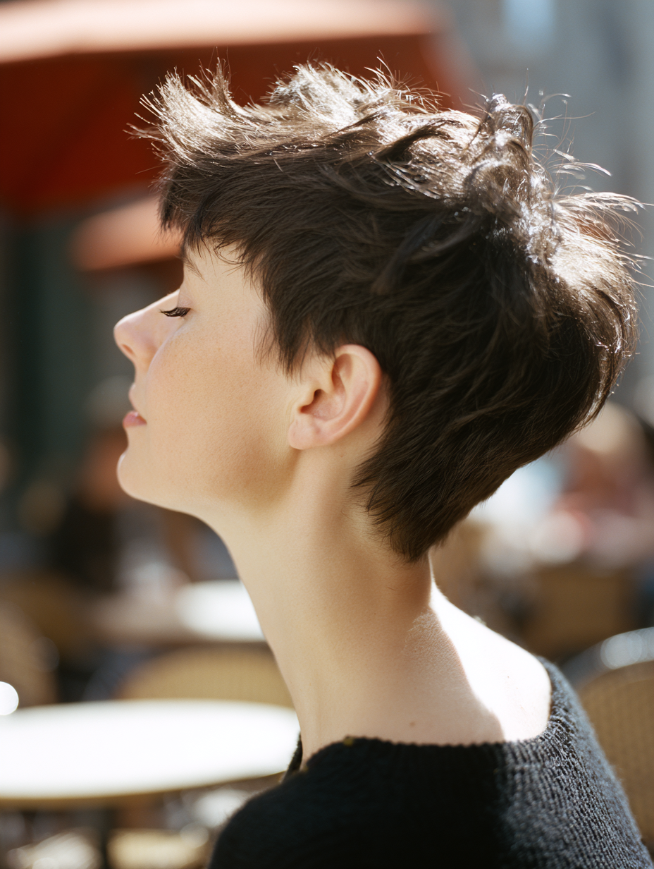 A textured pixie with a lifted crown gives your hair instant height. The short sides keep the cut neat, while the top section carries most of the volume.