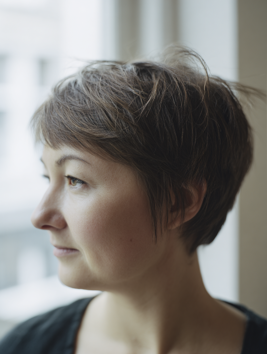 A tousled pixie brings airy texture that feels relaxed and easy. You can use your fingers to arrange the pieces without needing tools.