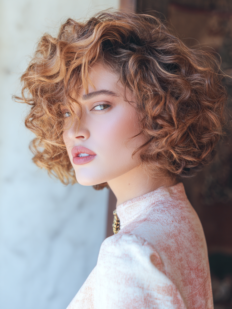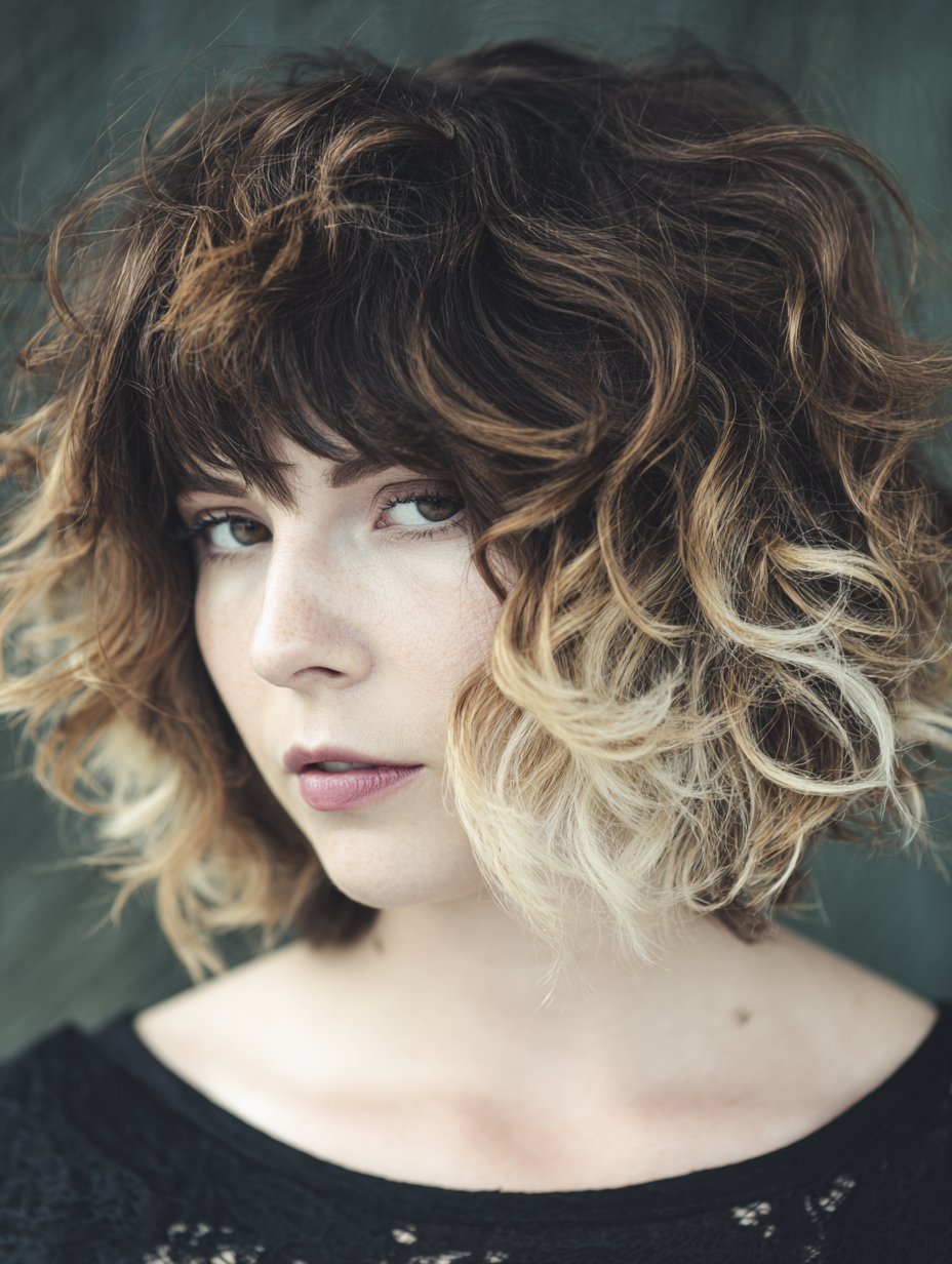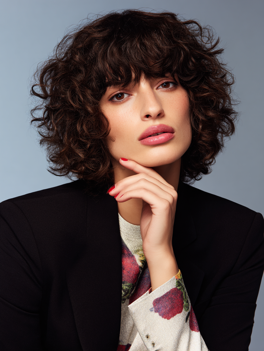 Wispy bangs lighten the expression and soften features, blending gently into layered curls.