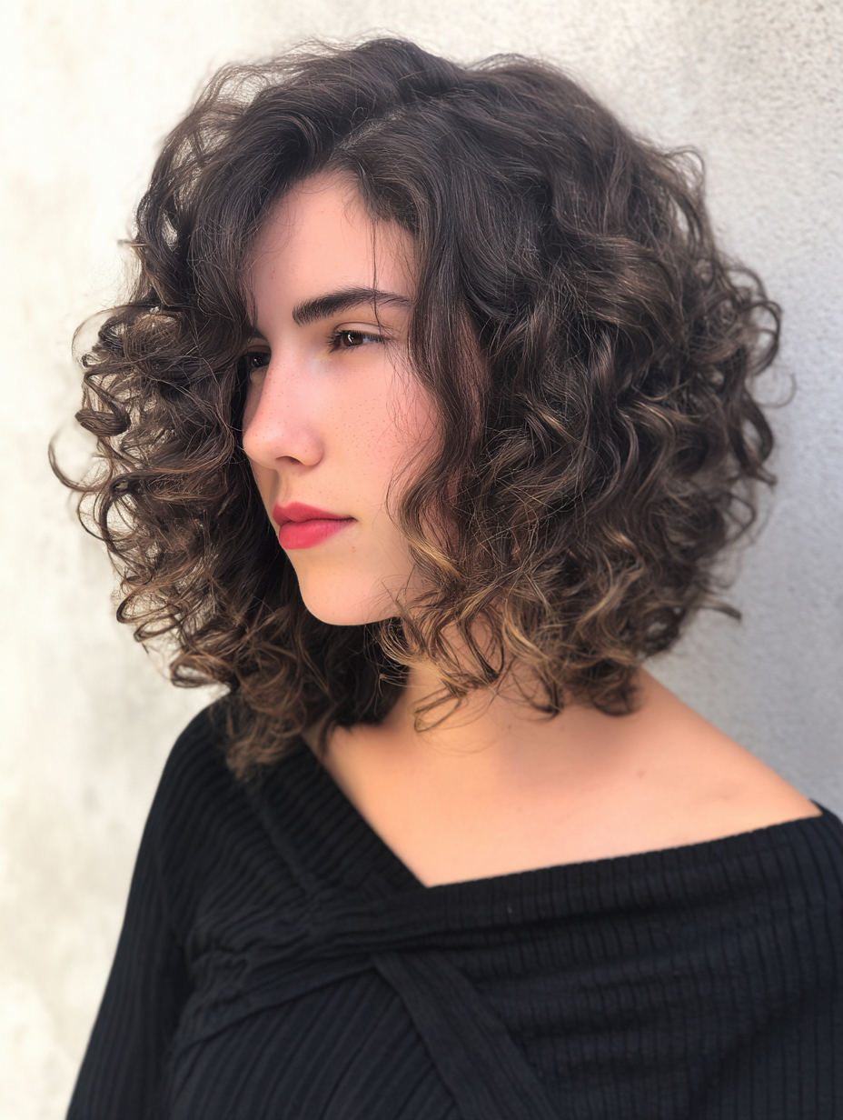Side-swept layers create a natural flow that gives curls a soft, angled shape.