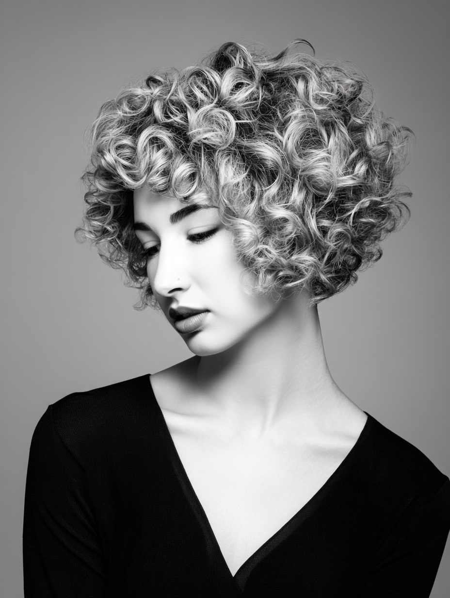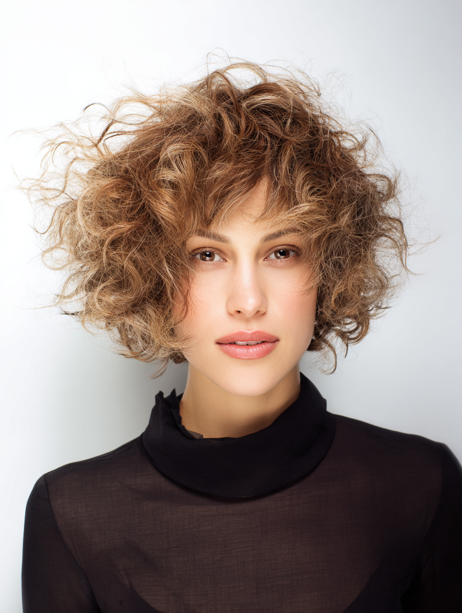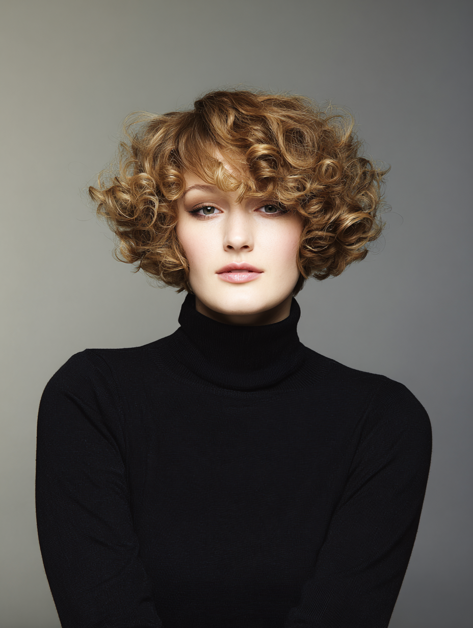 Hydrating mousse encourages separation so curls do not clump too tightly. The angled line along the jaw enhances definition and complements rounded facial features.