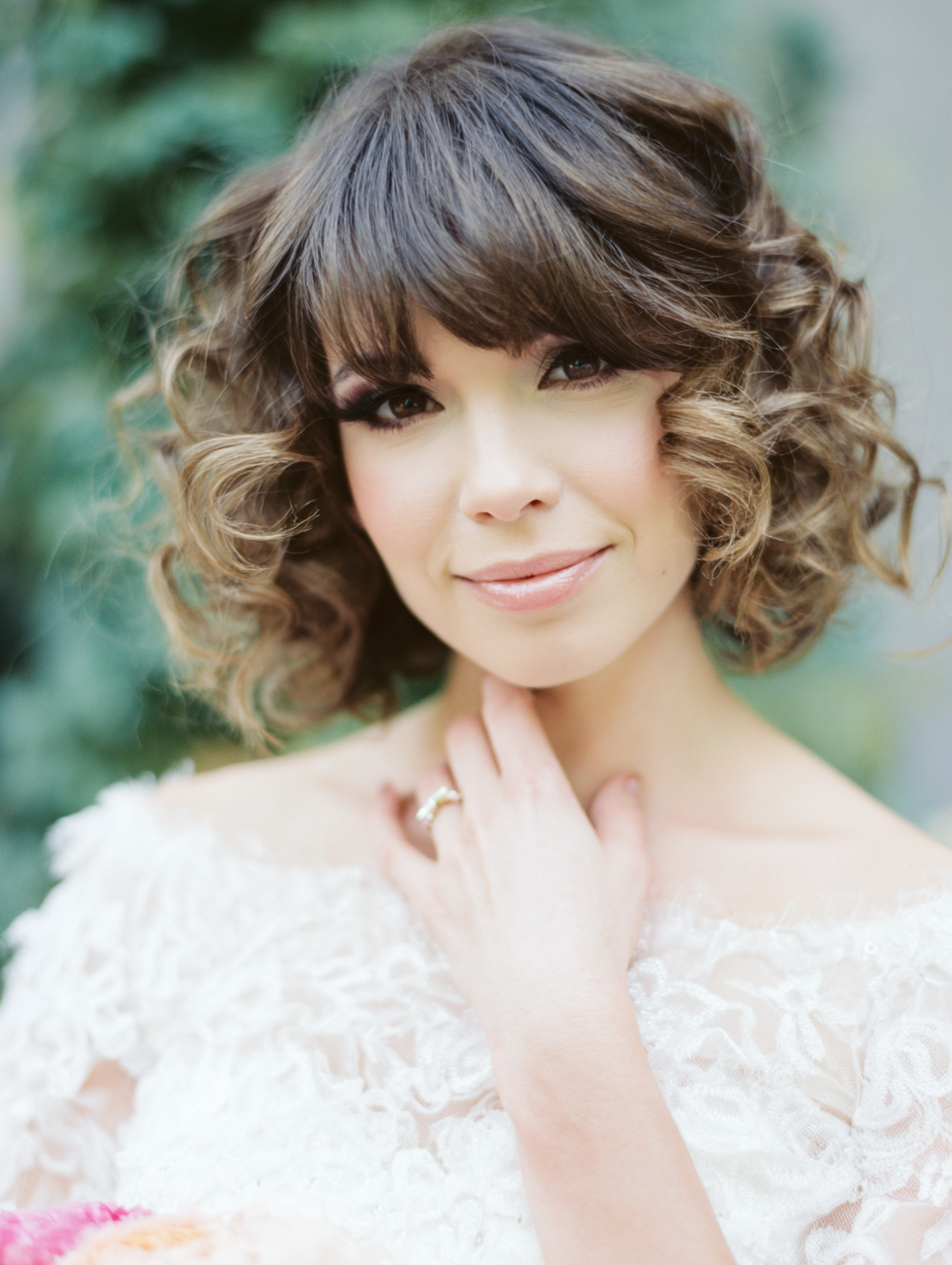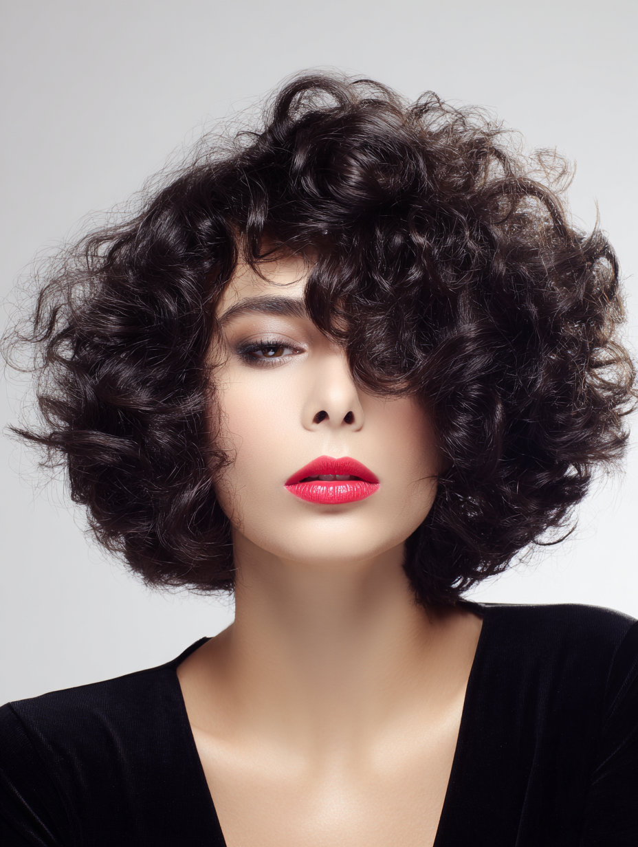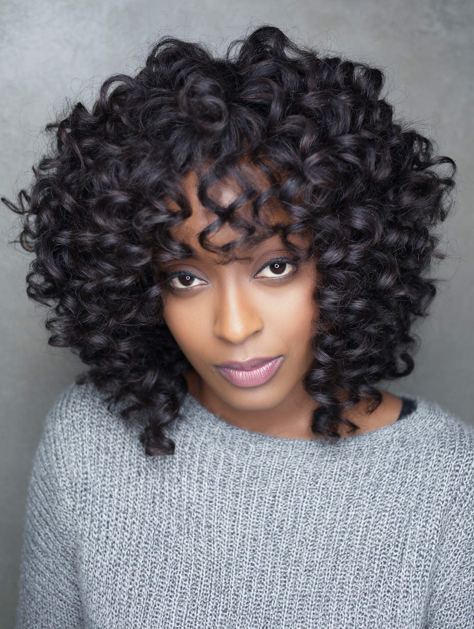 Face-framing bangs soften features and create a playful touch that pairs beautifully with layered curls.
