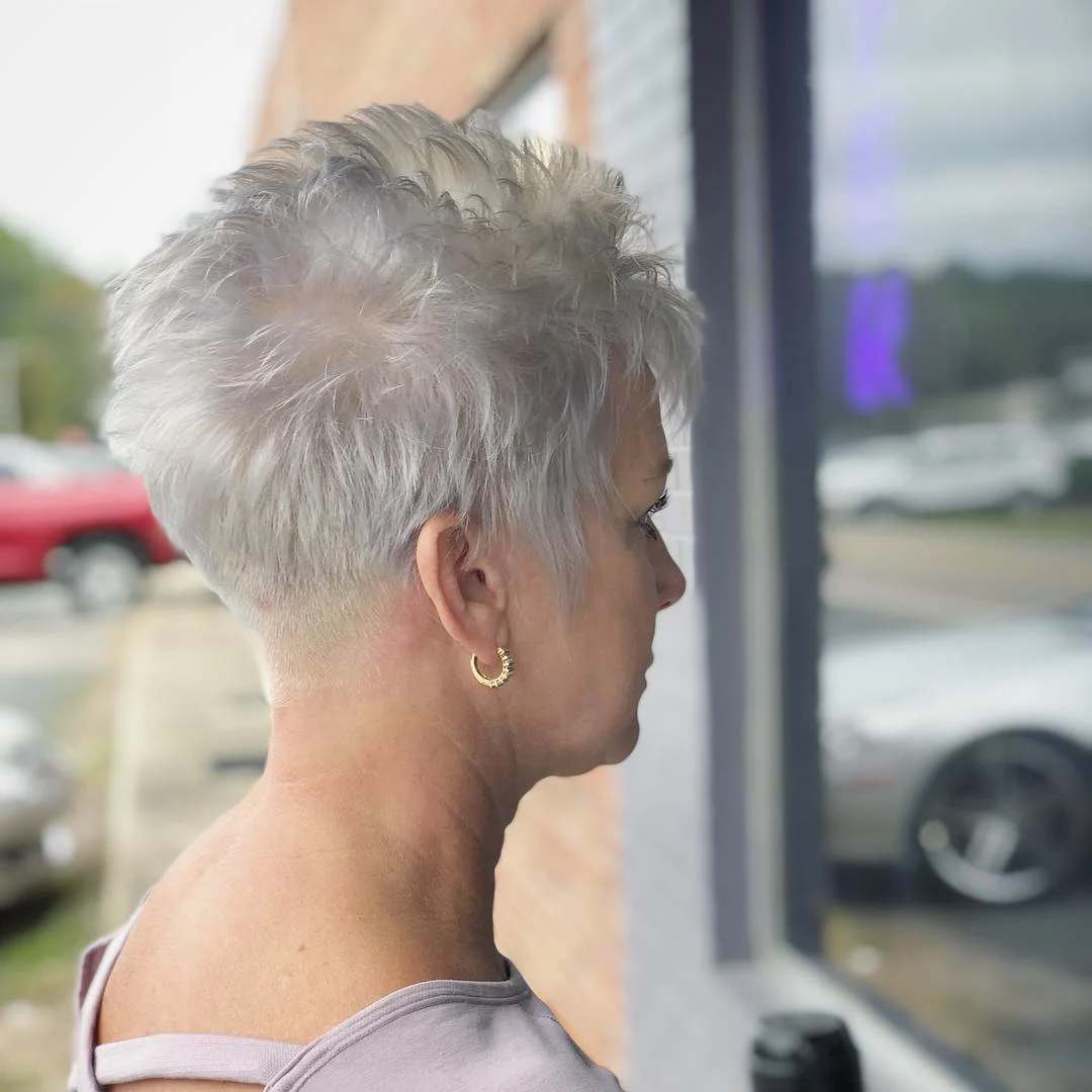 This silver pixie blends short tapered sides with longer, choppy layers on top to create an edgy, face-framing shape.