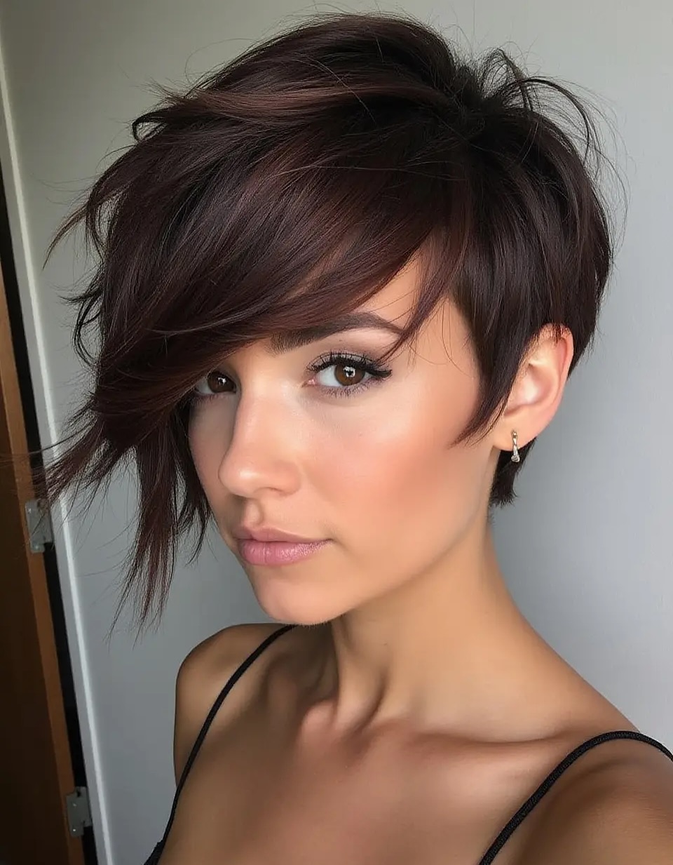 Tousled Dark Chocolate Pixie with Long Side Bangs
