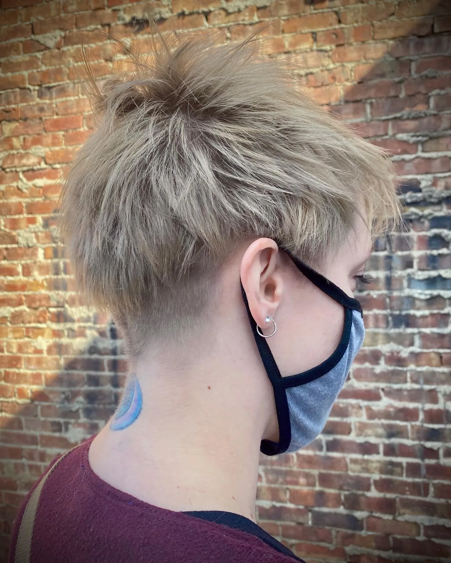 This spiky white pixie keeps the length very short while using textured layers to build subtle height at the crown.