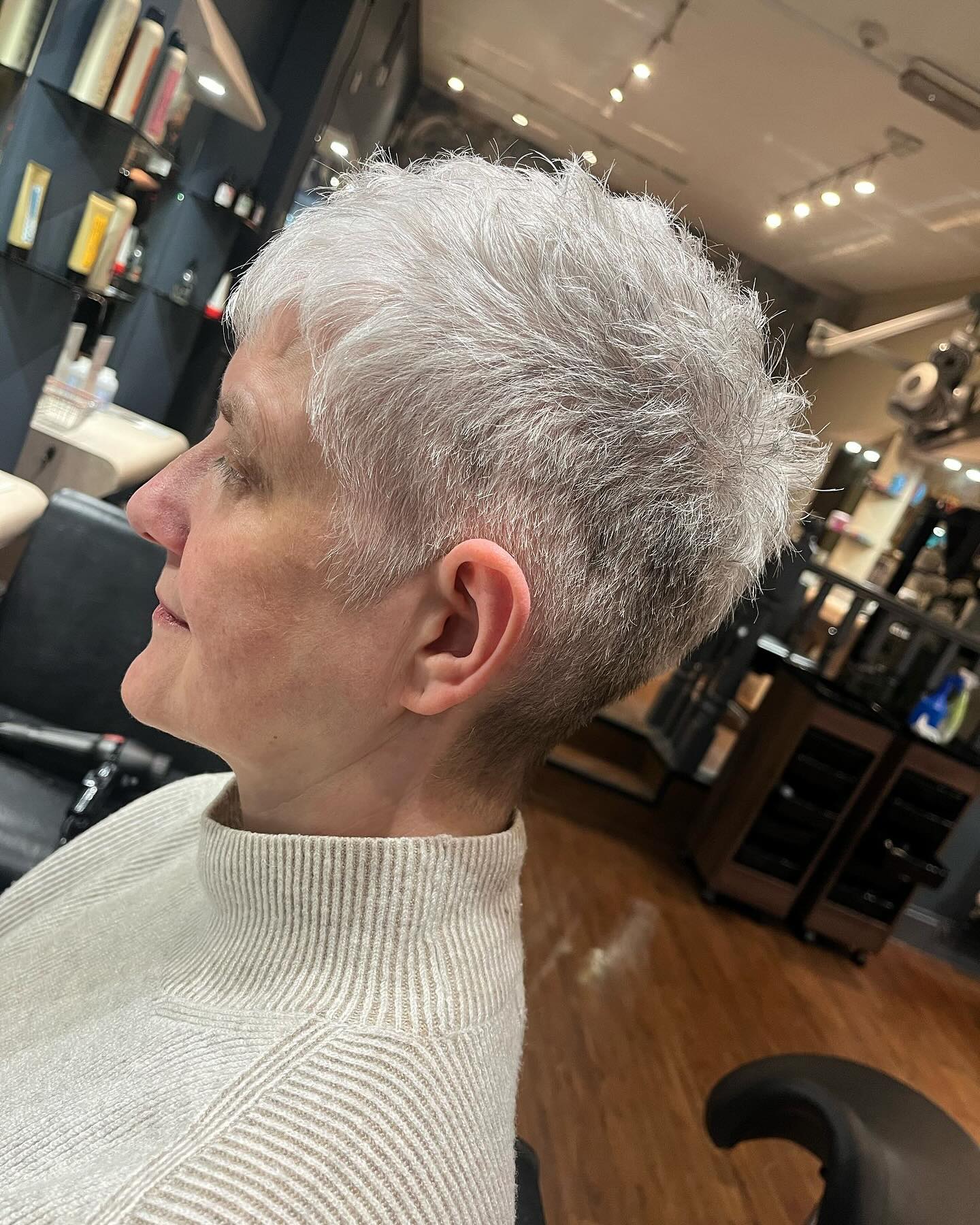 This silver pixie blends short tapered sides with longer, choppy layers on top to create an edgy, face-framing shape.