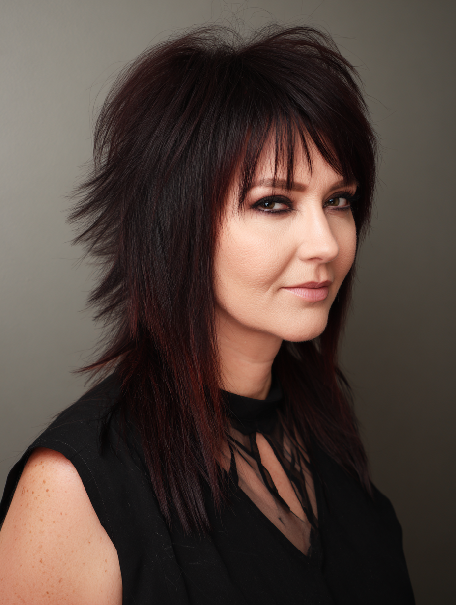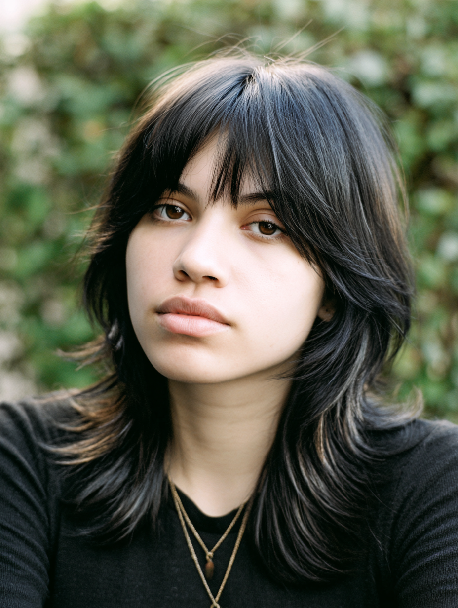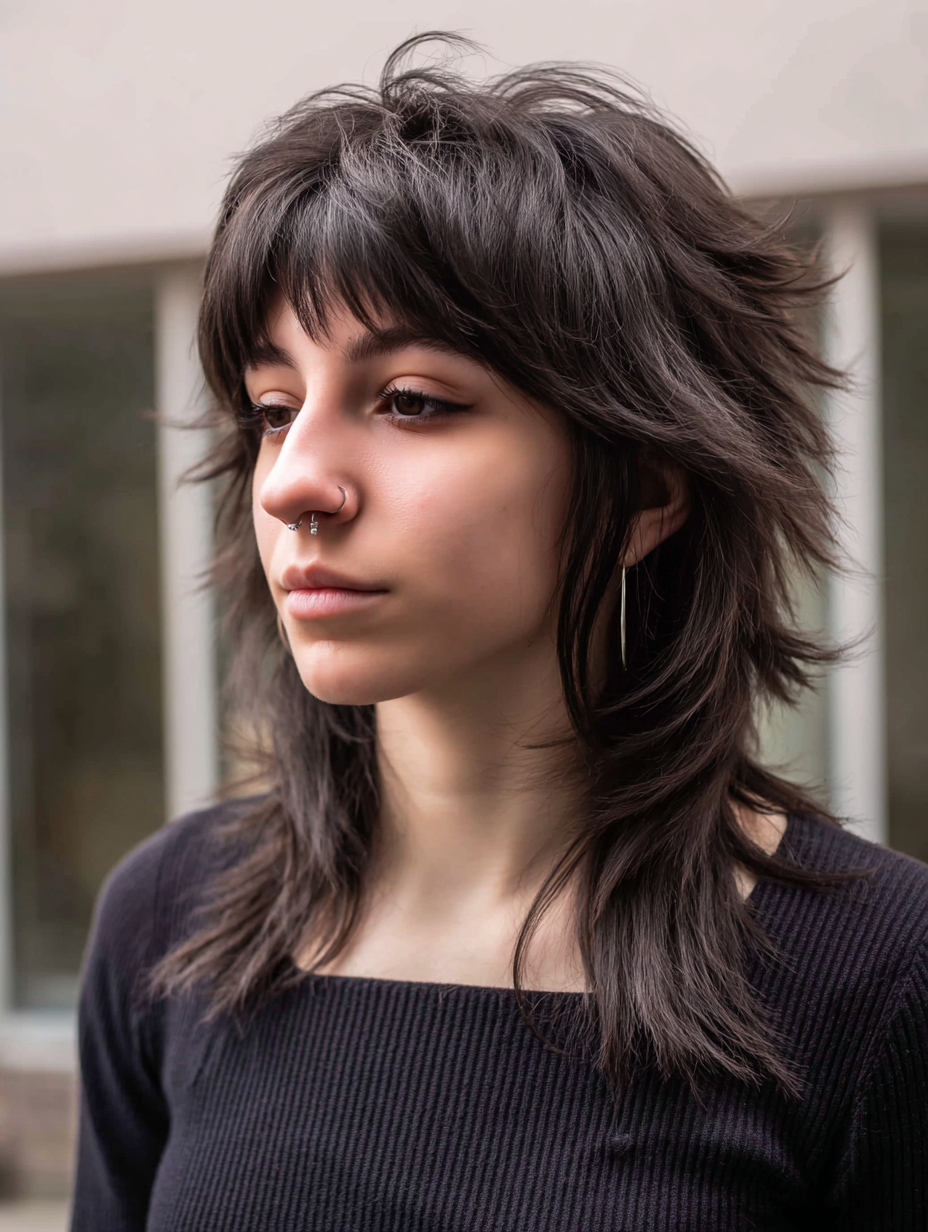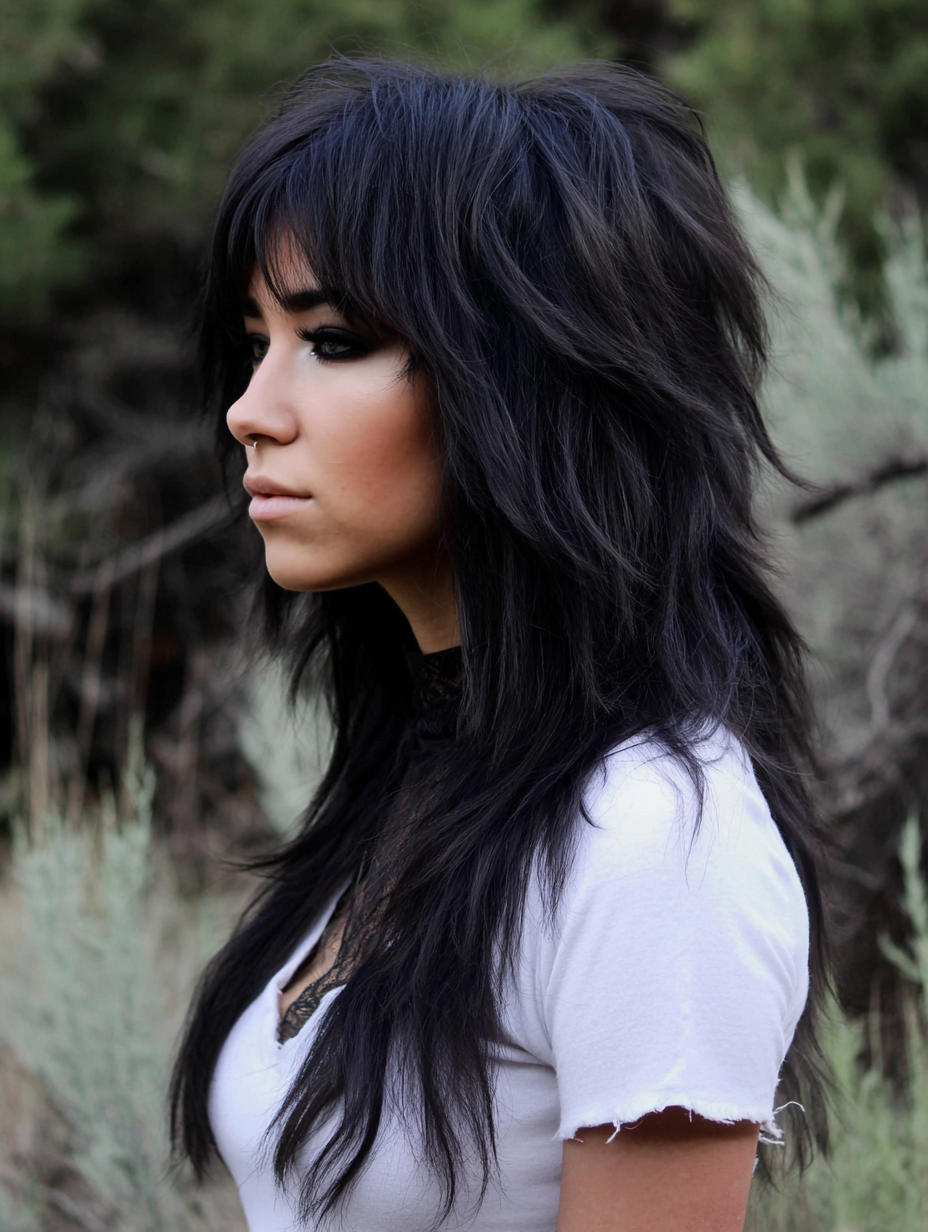 Long layers paired with heavy bangs make this emo shag feel bold yet balanced.