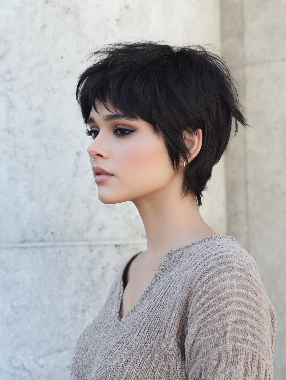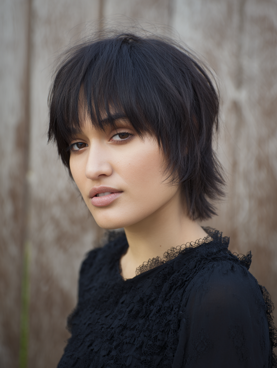 The fringe frames the eyes and cheekbones, adding a soft contrast to the edgy shape. Lightweight styling cream helps define layers while keeping hair touchable.