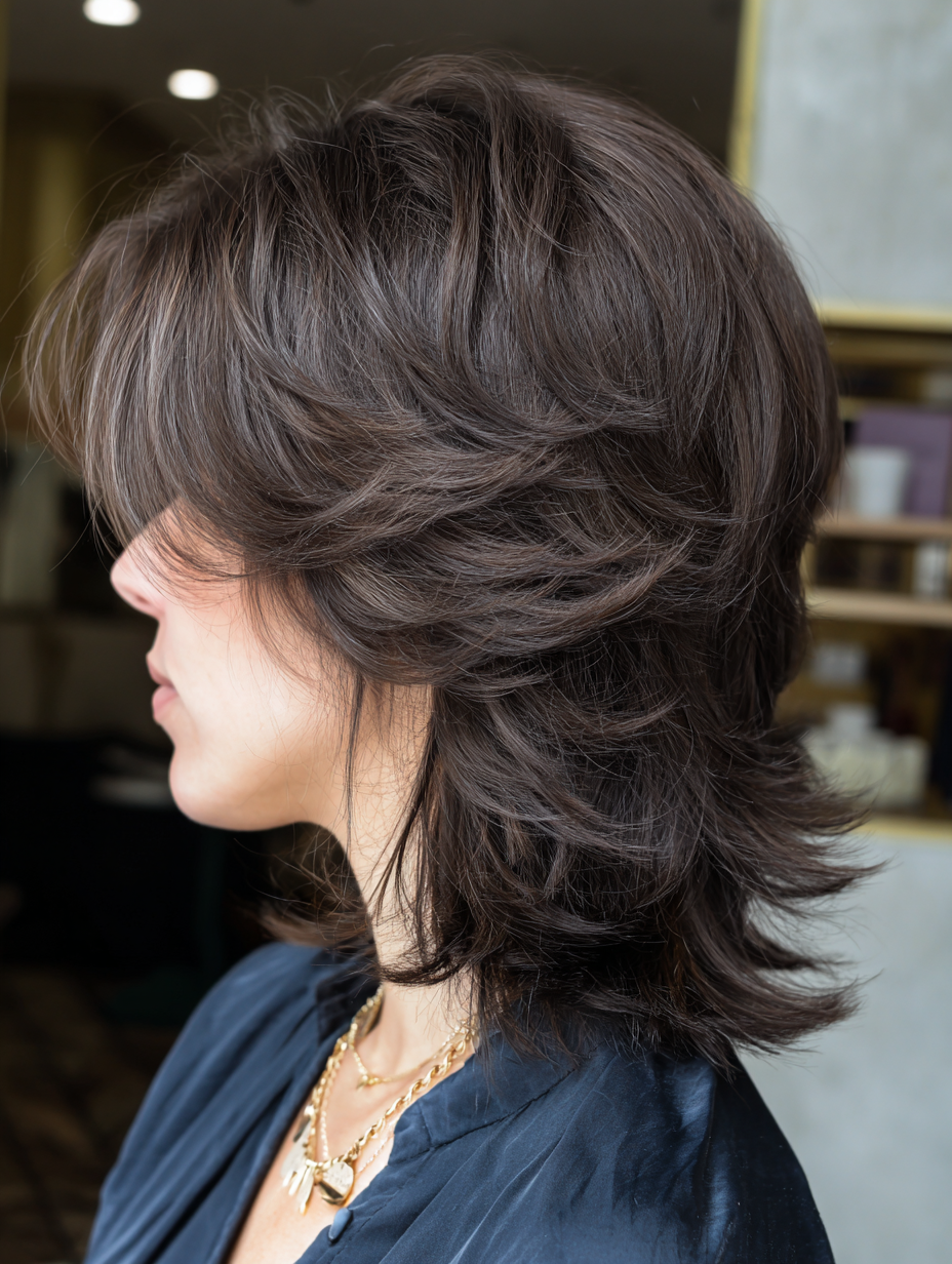 Instead of heavy chunkiness, the cut focuses on feathered ends that move easily. Side swept bangs blend smoothly into the rest of the style. A light styling mousse adds separation without stiffness.