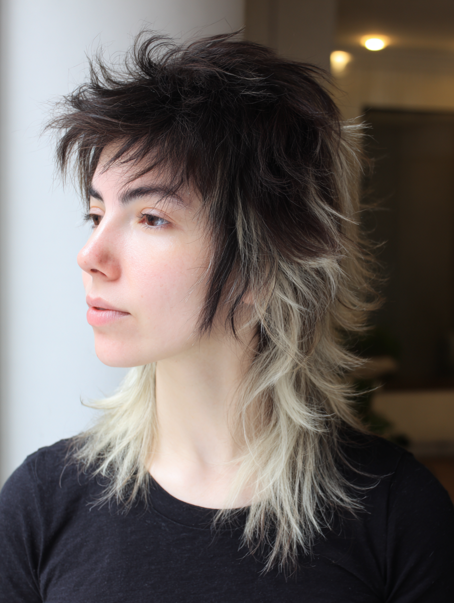 The look relies on choppy texture, face framing pieces, and an intentionally undone finish that adds movement and attitude. Instead of polished lines, the focus stays on contrast and personality, making the style feel raw and individual.