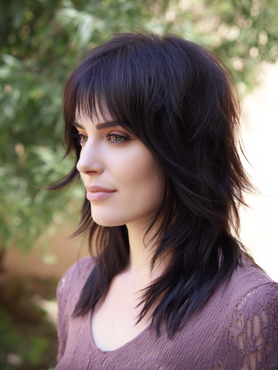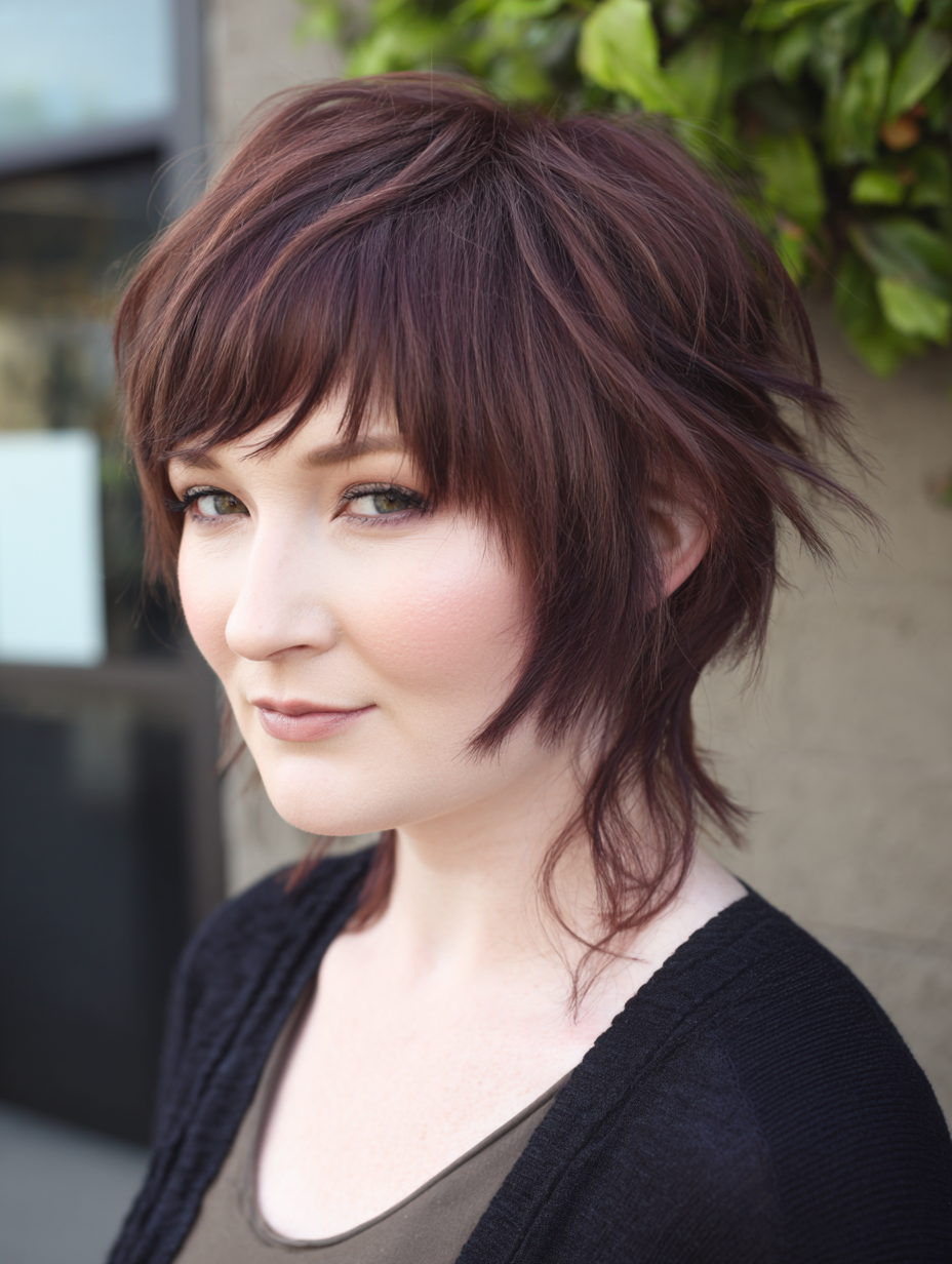 The bangs part naturally, blending into layered sides that frame the face. Choppy lengths throughout add texture without overpowering the look.