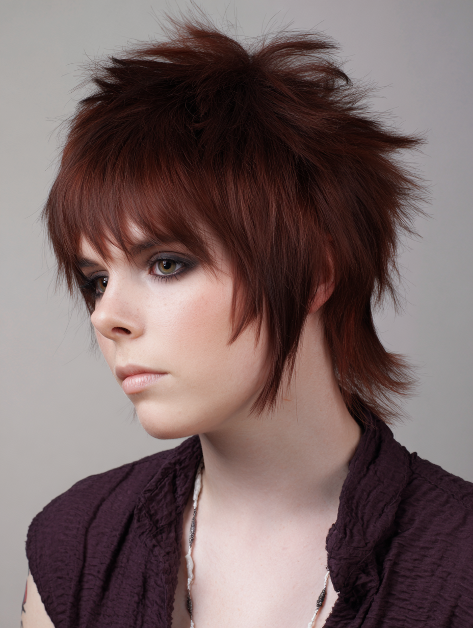 Sharp, spiky layers give this short emo shag a fearless, high energy feel.