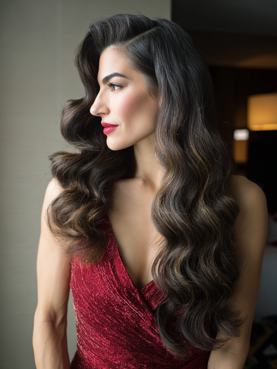 Glossy, sculpted waves bring instant red carpet energy to long hair without feeling stiff or overdone.