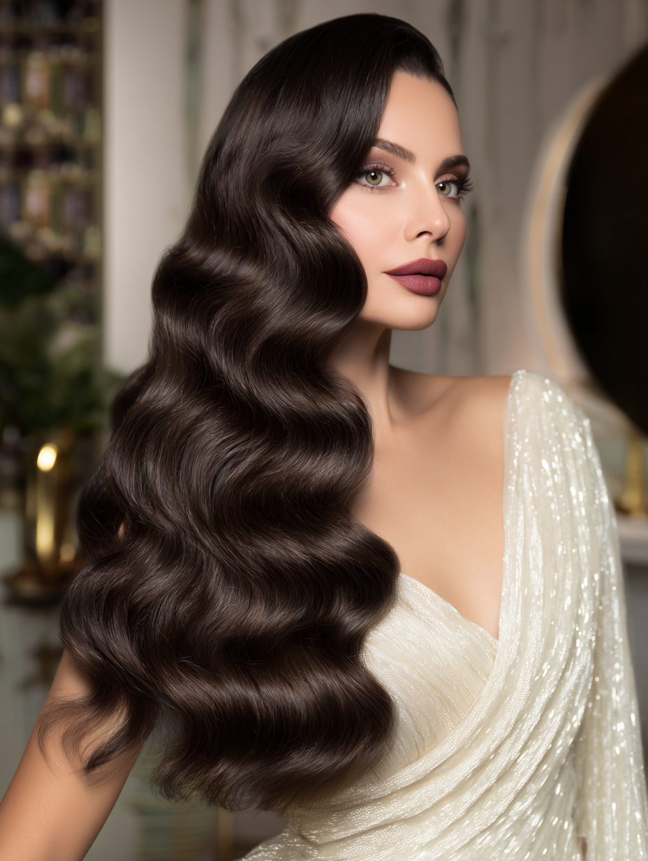 This style pairs beautifully with formal gowns, sleek dresses, or even tailored suits. Shine spray enhances the curves of each wave under evening lighting.
