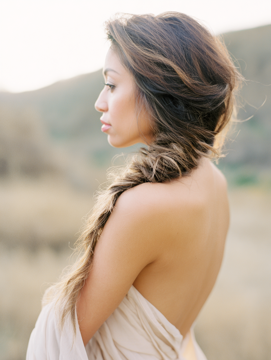 A fishtail braid pulled to one side feels intricate while still keeping a soft, romantic mood throughout.