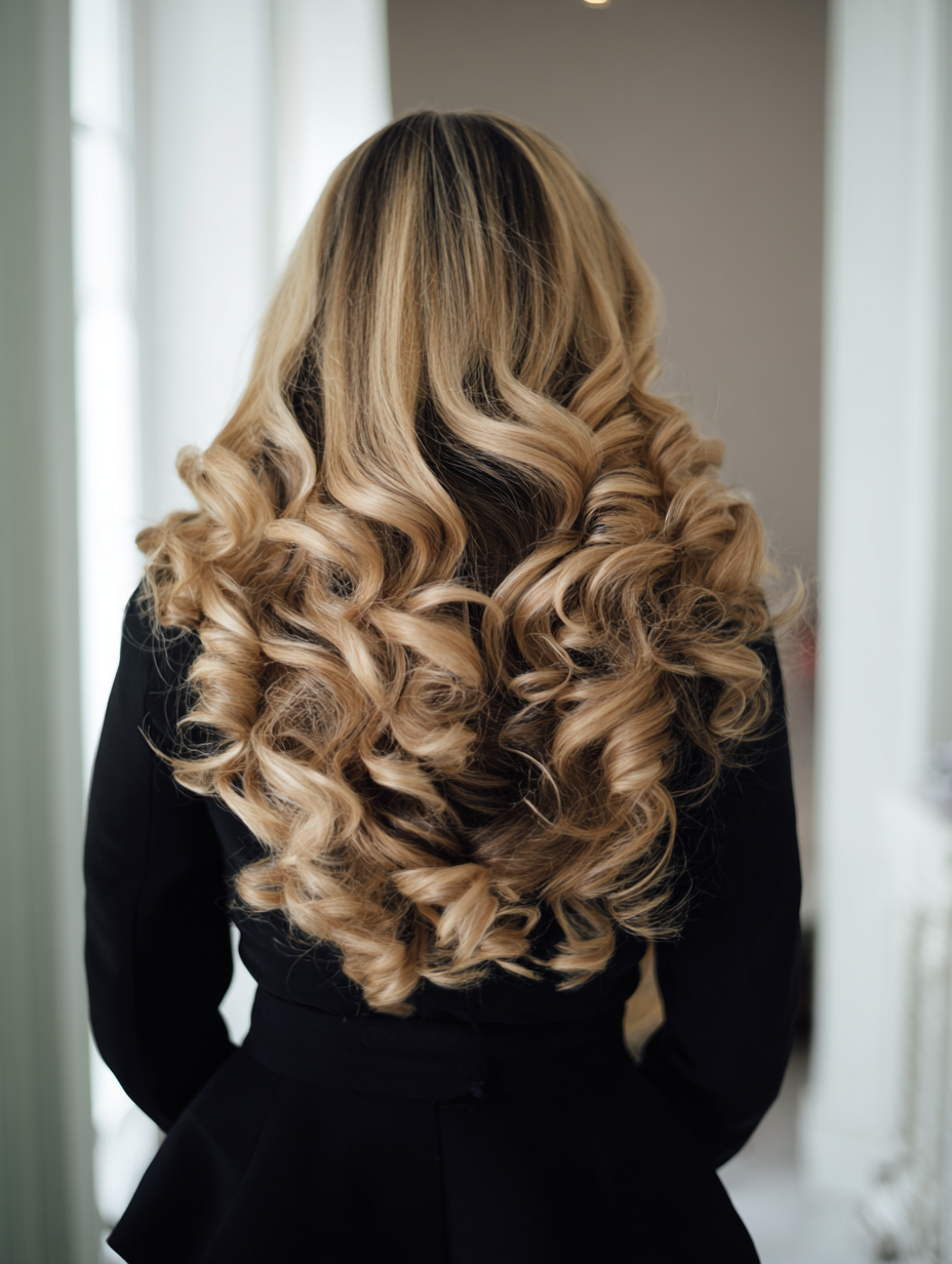 A round brush lift at the roots builds fullness that lasts through hours of wear. Soft curls cascade over the shoulders, catching light with every turn.