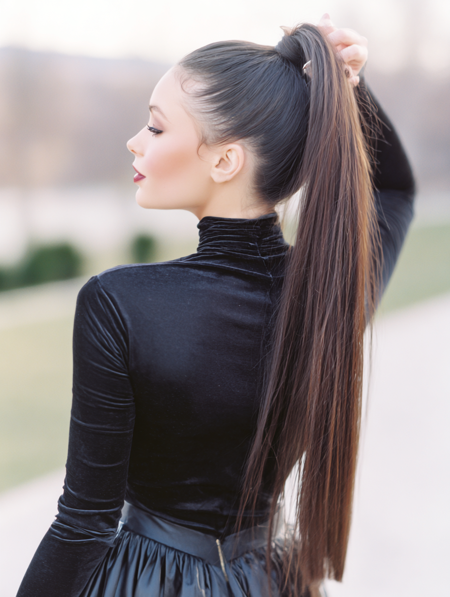 Polished roots and a smooth, lifted ponytail deliver bold sophistication with a modern edge for long hair.