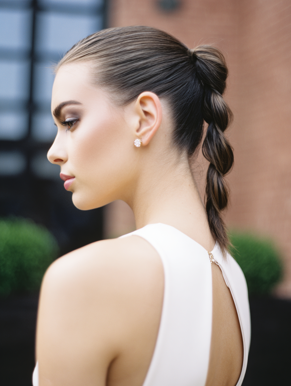 The braided detail adds texture while keeping the base sleek and polished. Wrapping a strand around the hair tie gives the style a finished, elevated feel.