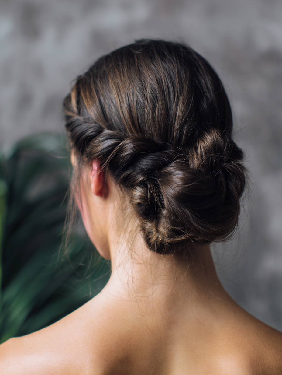 A braided low bun blends structure with detail, creating a formal style that feels thoughtfully designed.