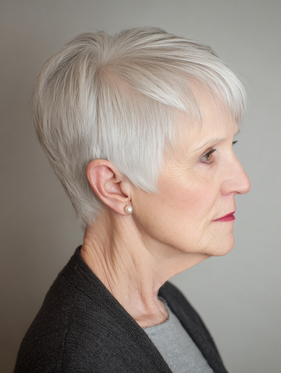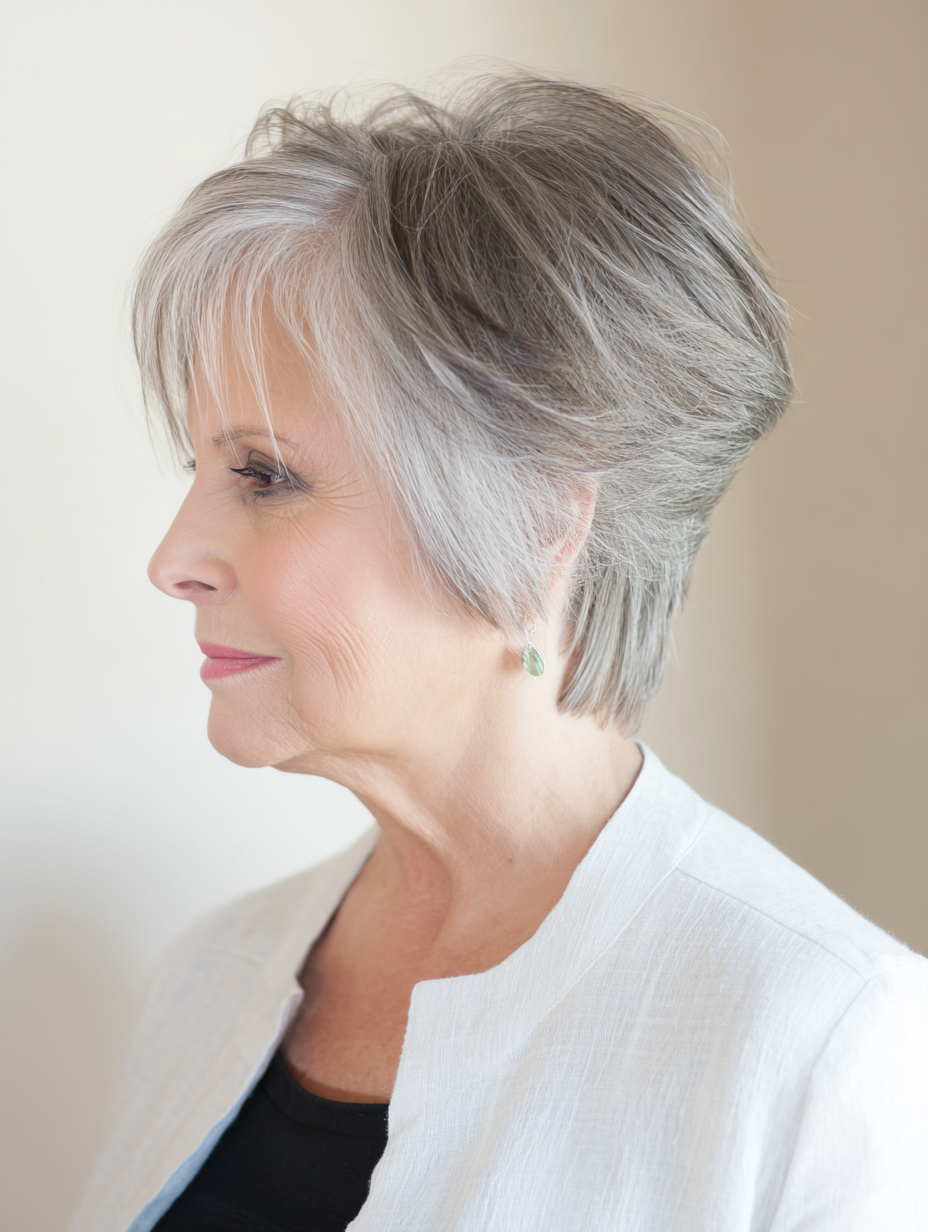Light layering prevents stiffness near the crown. Hair falls where it wants, which reduces styling frustration. This cut works well for hair that no longer holds heavy shapes.