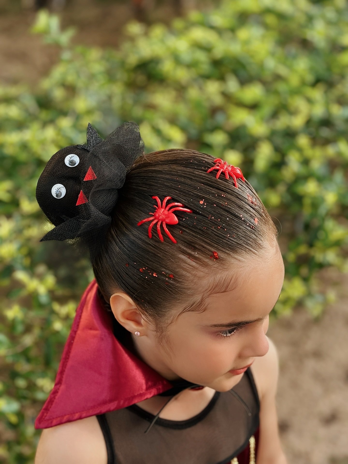 Red glitter and small plastic spiders scattered across the sleek hair add extra Halloween flair. The neat styling keeps everything secure while highlighting the fun decorations.