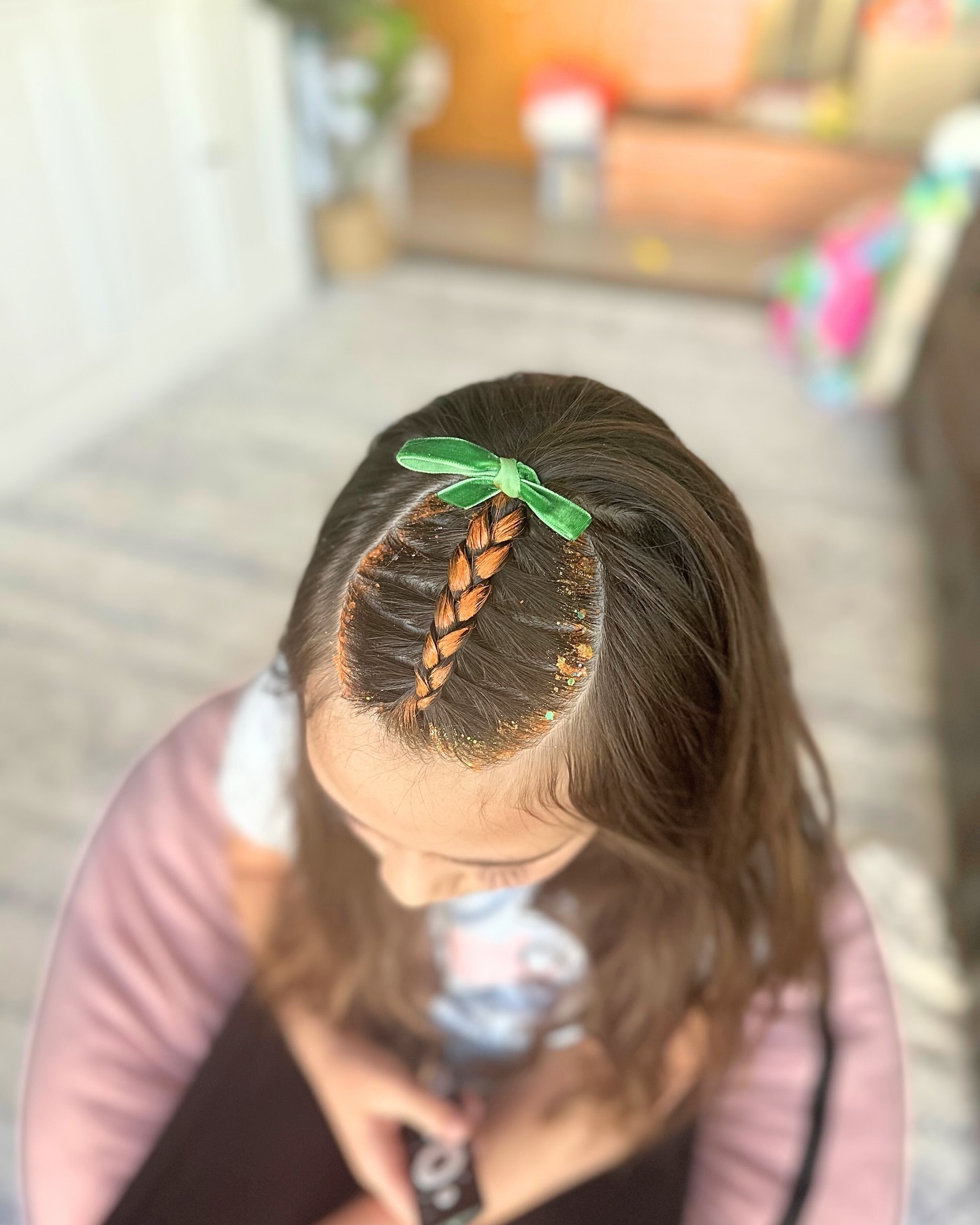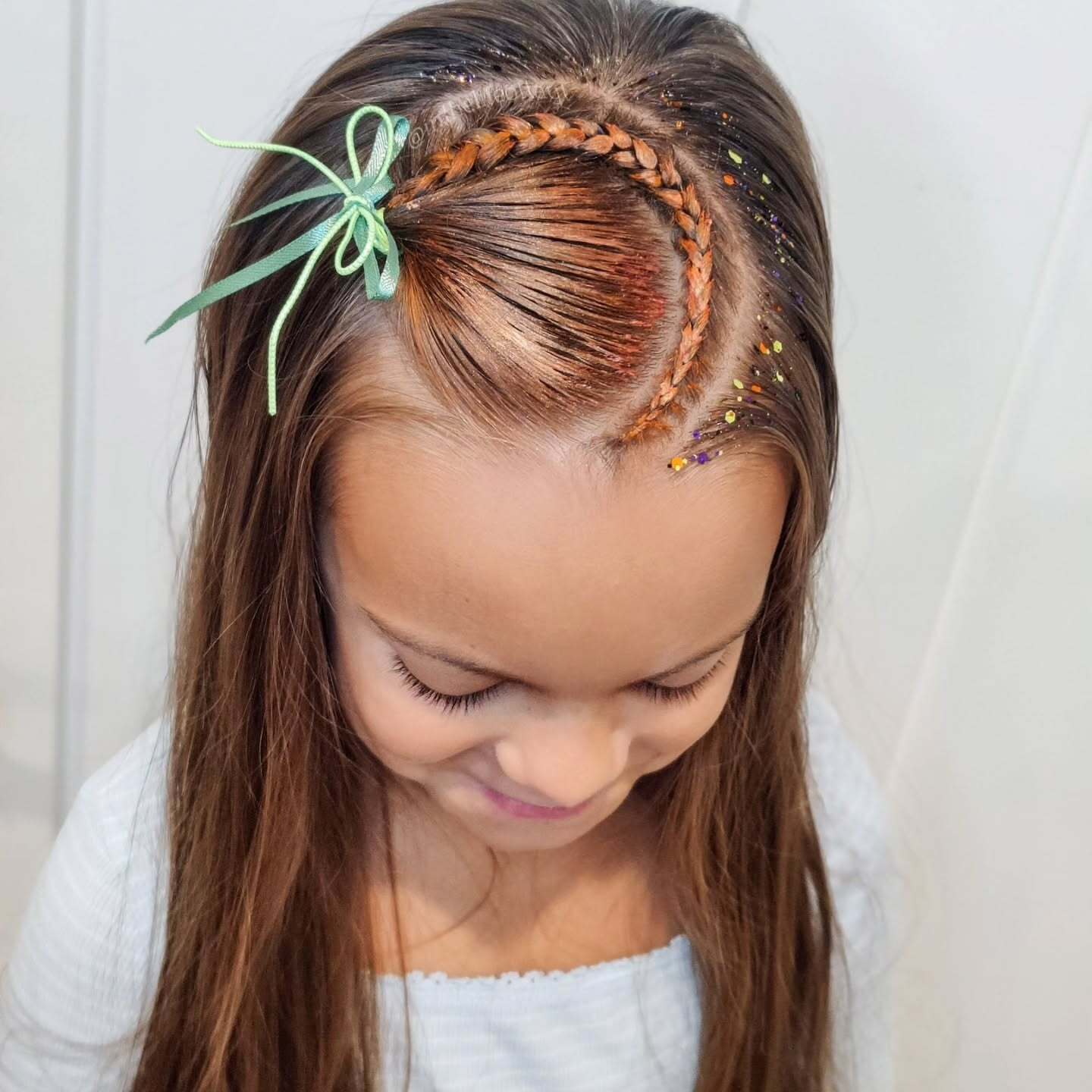 The surrounding hair is dusted with orange glitter, giving it a bright, festive shimmer. The rest of the hair is left down for a natural, comfortable finish