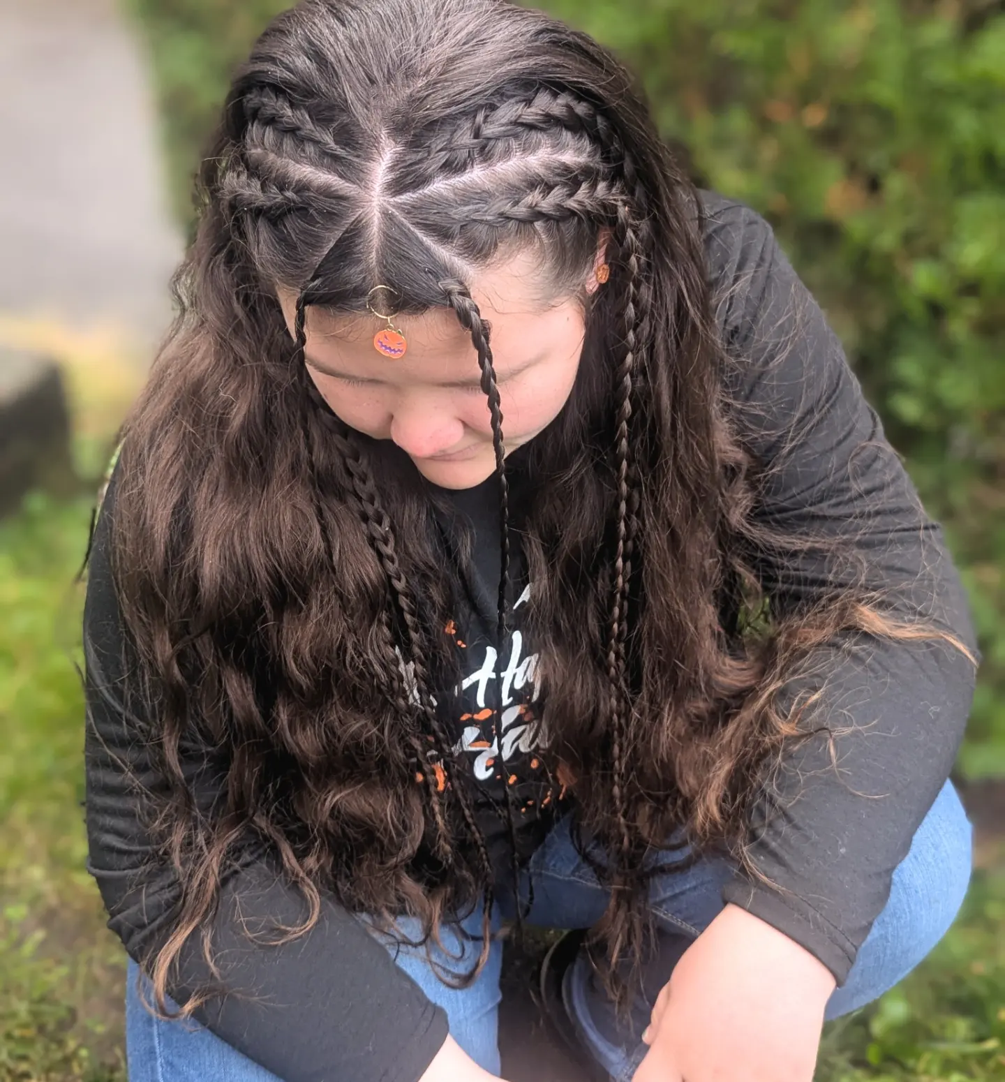 The top section features neatly parted hair styled into small braids that frame the face. A tiny pumpkin charm sits near the front, adding a festive pop of color.