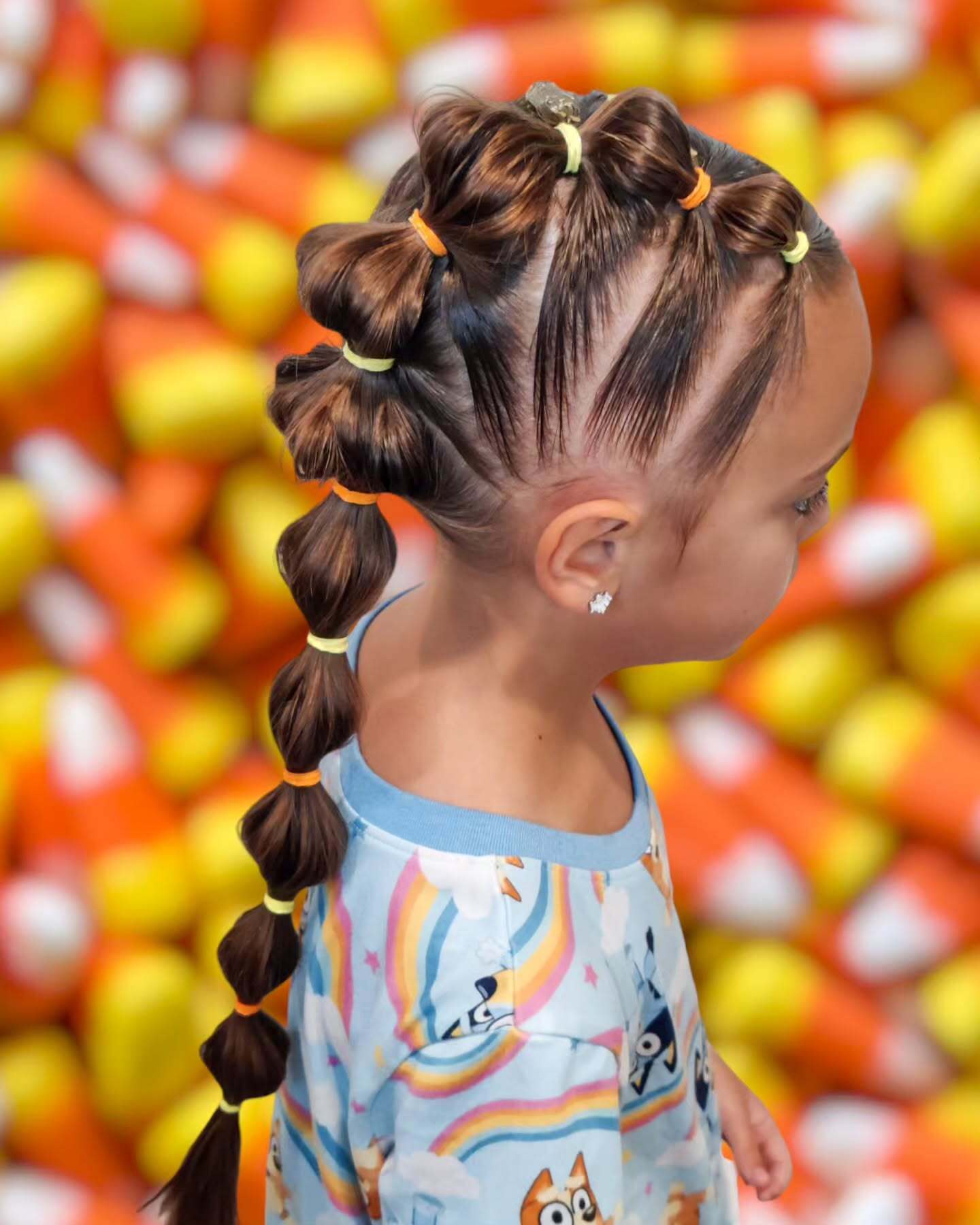 The hair is styled into a sleek bubble braid using orange, yellow, and white elastics to mimic the candy’s layers.