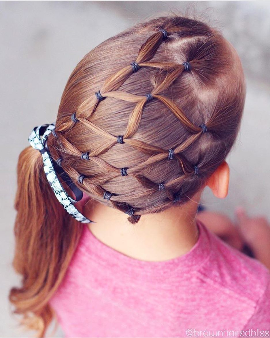 The top section of the hair is styled into a crisscross web pattern using small black elastics.